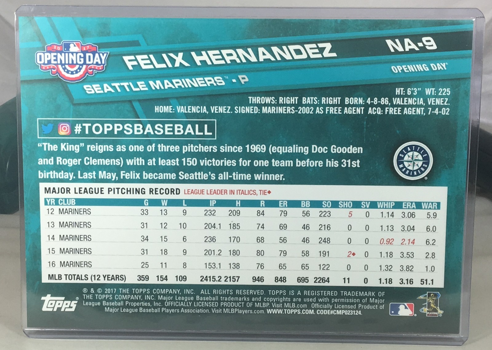 2017 TOPPS OPENING DAY NATIONAL ANTHEM #NA-9 FELIX HERNANDEZ SEATTLE MARINERS 46/49 All 5x7 cards are placed in a soft sleeve then in a top loader. W o rldwide shipping available. U.S. - Winning bidder to add $3.99 for careful USPS first class shipping with delivery confirmation. Add .50 for each additional item. Canada - Winning bidder to add $11.99 for careful USPS air mail shipping. All other countries - Winning bidder to add $12.99 for careful USPS air mail shipping. Bid with confidence, 49000+ feedback. Thanks and please see all of my auctions this week. Lots of PSA graded cards and etopps auctions for this week. I will be adding more PSA and etopps cards throughout the rest of the year, please subscribe to my store and check out all the cards. If you have not seen etopps cards before, they are cards originally offered online through their website. All cards come uncirculated in its own holder with an etopps seal and have a chrome/refractor look. Please note that combined ship rates are for items paid for on one invoice, thanks!