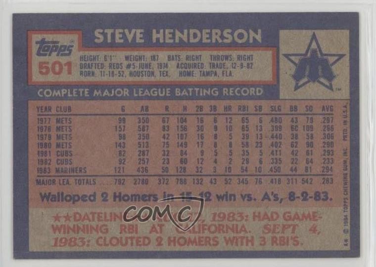 2017 Topps - Rediscover Topps Buybacks - Blue #1984-501 Steve Henderson - Baseball Card - Featuring the Seattle Mariners - Featuring Steve Henderson Search for more: 2017 Topps Search for more: 2017 Topps - Rediscover Topps Buybacks - Blue View all of our Listings Auctions Buy It Now About Us Located in the beautiful Pacific Northwest, COMC (Check Out My Cards) is the world's largest consignment service for trading card singles. More than 10,000 people have used our consignment service to list over 50 million trading cards. Find out how we can help you consign your items on eBay by contacting us through eBay messaging. COMC -- "The Safe & Easy Way to Buy & Sell" Representative Image - Select Specific Item above to see image of actual item Representative Image - Select Specific Item above to see image of actual item Raw Condition for Modern Cards Unless otherwise noted, raw modern cards are listed in Near Mint-Mint condition or better. A NM-MT card appears to be Mint at first glance, but upon closer inspection, may exhibit some of the following: minor print defects (e.g. roller marks, print line, dimple), minor scratches, slight edge wear, and slight corner wear. Centering is clearly visible in the images provided and does not factor into our condition assessment. Raw Condition for Vintage Cards Unless otherwise noted, raw vintage cards are listed in Excellent condition or better. An EX card may exhibit some of the following: minor rounding of corners, surface wear, print defects, light scratches, and slight edge wear/chipping. Centering is clearly visible in the images provided and does not factor into our condition assessment. Domestic Shipping Combined shipping for multiple items is available. To receive combined shipping, please ensure all desired items are in your eBay shopping cart before proceeding to checkout. eBay limits orders to 40 items per order. We automatically combine multiple orders placed on the same day. If you place multiple orders on the same day, please contact us to request a refund of applicable shipping costs. Signature confirmation may be required on invoices over $400. All cards are protected and shipped securely. International Shipping COMC offers eBay's International Shipping (EIS) for international orders under $2,500* (see country exceptions below). All duties and import fees are paid at checkout; in the rare event that there are additional import fees upon delivery, these are borne by the buyer. EIS packages route through a shipping hub in Erlanger, KY before shipping to their final destination. Please note that EIS does not allow for combined shipments. The shipping rates are determined by eBay and cannot be adjusted. *Maximum sale price exceptions: Colombia, Kuwait ($2,000); Taiwan ($1,539); Chile, Costa Rica, Guatemala, Honduras, Trinidad and Tobago ($1,000); Antigua and Barbuda, Aruba, Belize, Dominica, Grenada, Philippines, Saint Kitts and Nevis, Saint Lucia, Montserrat, Turks and Caicos Islands ($500); Dominican Republic, El Salvador ($200). Please request a shipping quote through eBay messaging for orders that exceed the maximum sale price supported by eBay's International Shipping. You will be responsible for all duties and import fees for international orders shipped outside the EIS. All cards are protected and shipped securely. Payment COMC does not accept offers on our cards through our eBay storefront. COMC utilizes eBay’s managed payments system. If you are experiencing difficulties making a payment, please contact eBay for assistance. Return Policy Returns are only accepted on the rare occasion the item is not as described. If you are making a return, please initiate the return process through eBay so a mailing label can be provided for you. Prior to listing, our expert team carefully assessed this item to represent it accurately. Please review the description and high-definition images prior to purchasing to ensure this item meets your satisfaction. We welcome you to contact us if you have further questions about this item. Trust and Integrity COMC carefully assesses each item consigned to us to prevent fraudulent items from entering the marketplace. If you believe an item offered on COMC may be fraudulent, please contact us with details so we can investigate the issue. Items we determine are outside our supported items policy may be removed. Last Modified: 6/14/2025 3:08:37 AM PDT