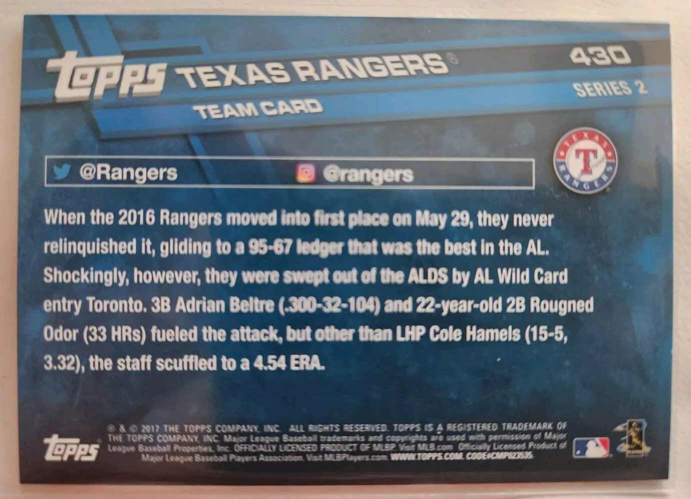 Capture a slice of baseball history with the 2017 Topps Series 2 #430 Texas Rangers Team Card. This MLB collectible features the iconic Texas Rangers roster from the 2017 season, presented on a classic card stock material that's a nod to the sport's rich tradition. A must-have for any baseball card enthusiast or Rangers fan, the card is part of the renowned 2017 Topps Base Set, showcasing the craftsmanship of the renowned manufacturer, Topps. Proudly made in the United States, the card comes in standard size and English language, making it a seamless addition to any collection. As an original print, not autographed, it embodies the essence of the sport and offers a genuine connection to Major League Baseball. Whether for display or as a treasured keepsake, this team card is a tangible piece of the 2017 baseball season. Welcome to Card Crack Chronicles β Your Source for Cards of All Eras and Types! From rookies and legends to inserts and hidden gems, our store offers a wide variety of trading cards across all sports and years. Stock is updated regularly, so be sure to follow Card Crack Chronicles and check back often! π Shipping Information π¨π¦ Within Canada: Lettermail (Untracked): $2.99 for the first card + $0.25 for each additional card. Tracked Shipping (Expedited): $7.99 for the first card + $0.25 for each additional. π¦ Tracked shipping is required for any item priced $5.00 or more. This ensures safe delivery and peace of mind for both buyer and seller. All cards are shipped in a penny sleeve and toploader for protection. ?? Shipping to the USA: Standard Shipping (Untracked): $4.99 for the first card + $0.25 per extra. Tracked Lettermail: $11.99 for the first card + $0.25 per extra. ? Tracked shipping is required for any item priced $5.00 or more. It provides tracking and delivery confirmation, especially important for cross-border shipments. Note: U.S.-bound cards are shipped in penny sleeves only (no toploaders due to customs restrictions) but are always packaged securely. ? Local Pickup (Hamilton, Ontario): Free local pickup available! Message before purchasing to arrange a time. ? Important Info You?ll always receive the exact card shown in the listing. Tracked shipping is required for all items $5 and up. Orders are shipped within 2 business days after payment is received. Payment is expected within 2 days of purchase. ? Tip: New cards are added regularly?follow the store and come back often to see what?s new at Card Crack Chronicles!