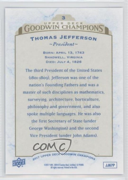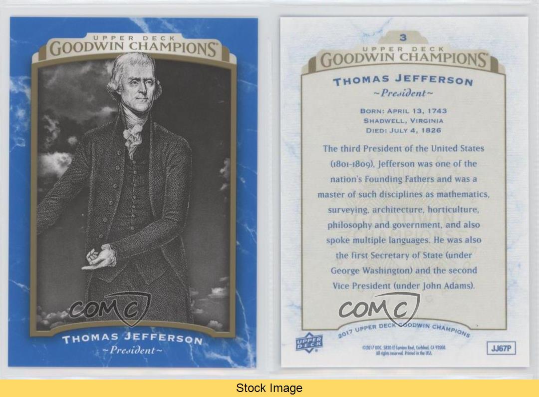 2017 Upper Deck Goodwin Champions - [Base] - Royal Blue #3 Thomas Jefferson - MultiSport Card - Featuring Thomas Jefferson Search for more: 2017 Upper Deck Goodwin Champions Search for more: 2017 Upper Deck Goodwin Champions - [Base] - Royal Blue View all of our Listings Auctions Buy It Now About Us Located in the beautiful Pacific Northwest, COMC (Check Out My Cards) is the world's largest consignment service for trading card singles. More than 10,000 people have used our consignment service to list over 50 million trading cards. Find out how we can help you consign your items on eBay by contacting us through eBay messaging. COMC -- "The Safe & Easy Way to Buy & Sell" Representative Image - Select Specific Item above to see image of actual item Representative Image - Select Specific Item above to see image of actual item Raw Condition for Modern Cards Unless otherwise noted, raw modern cards are listed in Near Mint-Mint condition or better. A NM-MT card appears to be Mint at first glance, but upon closer inspection, may exhibit some of the following: minor print defects (e.g. roller marks, print line, dimple), minor scratches, slight edge wear, and slight corner wear. Centering is clearly visible in the images provided and does not factor into our condition assessment. Raw Condition for Vintage Cards Unless otherwise noted, raw vintage cards are listed in Excellent condition or better. An EX card may exhibit some of the following: minor rounding of corners, surface wear, print defects, light scratches, and slight edge wear/chipping. Centering is clearly visible in the images provided and does not factor into our condition assessment. Domestic Shipping Combined shipping for multiple items is available. To receive combined shipping, please ensure all desired items are in your eBay shopping cart before proceeding to checkout. eBay limits orders to 40 items per order. We automatically combine multiple orders placed on the same day. If you place multiple orders on the same day, please contact us to request a refund of applicable shipping costs. Signature confirmation may be required on invoices over $400. All cards are protected and shipped securely. International Shipping COMC offers eBay's International Shipping (EIS) for international orders under $2,500* (see country exceptions below). All duties and import fees are paid at checkout; in the rare event that there are additional import fees upon delivery, these are borne by the buyer. EIS packages route through a shipping hub in Erlanger, KY before shipping to their final destination. Please note that EIS does not allow for combined shipments. The shipping rates are determined by eBay and cannot be adjusted. *Maximum sale price exceptions: Colombia, Kuwait ($2,000); Taiwan ($1,539); Chile, Costa Rica, Guatemala, Honduras, Trinidad and Tobago ($1,000); Antigua and Barbuda, Aruba, Belize, Dominica, Grenada, Philippines, Saint Kitts and Nevis, Saint Lucia, Montserrat, Turks and Caicos Islands ($500); Dominican Republic, El Salvador ($200). Please request a shipping quote through eBay messaging for orders that exceed the maximum sale price supported by eBay's International Shipping. You will be responsible for all duties and import fees for international orders shipped outside the EIS. All cards are protected and shipped securely. Payment COMC does not accept offers on our cards through our eBay storefront. COMC utilizes eBay’s managed payments system. If you are experiencing difficulties making a payment, please contact eBay for assistance. Return Policy Returns are only accepted on the rare occasion the item is not as described. If you are making a return, please initiate the return process through eBay so a mailing label can be provided for you. Prior to listing, our expert team carefully assessed this item to represent it accurately. Please review the description and high-definition images prior to purchasing to ensure this item meets your satisfaction. We welcome you to contact us if you have further questions about this item. Trust and Integrity COMC carefully assesses each item consigned to us to prevent fraudulent items from entering the marketplace. If you believe an item offered on COMC may be fraudulent, please contact us with details so we can investigate the issue. Items we determine are outside our supported items policy may be removed. Last Modified: 6/14/2025 11:22:08 PM PDT