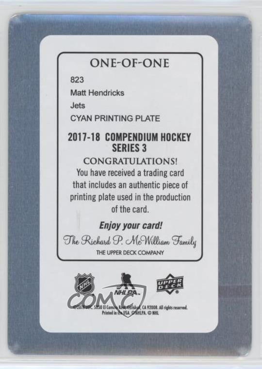 2017-18 Upper Deck Compendium - [Base] - Printing Plate Cyan #823 Matt Hendricks Serial #1/1 COMC Item: 50578015 - Ice Hockey Card - Featuring the Winnipeg Jets - Featuring Matt Hendricks Search for more: 2017-18 Upper Deck Compendium Search for more: 2017-18 Upper Deck Compendium - [Base] - Printing Plate Cyan View all of our Listings Auctions Buy It Now About Us Located in the beautiful Pacific Northwest, COMC (Check Out My Cards) is the world's largest consignment service for trading card singles. More than 10,000 people have used our consignment service to list over 50 million trading cards. Find out how we can help you consign your items on eBay by contacting us through eBay messaging. COMC -- "The Safe & Easy Way to Buy & Sell" Raw Condition for Modern Cards Unless otherwise noted, raw modern cards are listed in Near Mint-Mint condition or better. A NM-MT card appears to be Mint at first glance, but upon closer inspection, may exhibit some of the following: minor print defects (e.g. roller marks, print line, dimple), minor scratches, slight edge wear, and slight corner wear. Centering is clearly visible in the images provided and does not factor into our condition assessment. Raw Condition for Vintage Cards Unless otherwise noted, raw vintage cards are listed in Excellent condition or better. An EX card may exhibit some of the following: minor rounding of corners, surface wear, print defects, light scratches, and slight edge wear/chipping. Centering is clearly visible in the images provided and does not factor into our condition assessment. Domestic Shipping Combined shipping for multiple items is available. To receive combined shipping, please ensure all desired items are in your eBay shopping cart before proceeding to checkout. eBay limits orders to 40 items per order. We automatically combine multiple orders placed on the same day. If you place multiple orders on the same day, please contact us to request a refund of applicable shipping costs. Signature confirmation may be required on invoices over $400. All cards are protected and shipped securely. International Shipping COMC offers eBay's International Shipping (EIS) for international orders under $2,500* (see country exceptions below). All duties and import fees are paid at checkout; in the rare event that there are additional import fees upon delivery, these are borne by the buyer. EIS packages route through a shipping hub in Erlanger, KY before shipping to their final destination. Please note that EIS does not allow for combined shipments. The shipping rates are determined by eBay and cannot be adjusted. *Maximum sale price exceptions: Colombia, Kuwait ($2,000); Taiwan ($1,539); Chile, Costa Rica, Guatemala, Honduras, Trinidad and Tobago ($1,000); Antigua and Barbuda, Aruba, Belize, Dominica, Grenada, Philippines, Saint Kitts and Nevis, Saint Lucia, Montserrat, Turks and Caicos Islands ($500); Dominican Republic, El Salvador ($200). Please request a shipping quote through eBay messaging for orders that exceed the maximum sale price supported by eBay's International Shipping. You will be responsible for all duties and import fees for international orders shipped outside the EIS. All cards are protected and shipped securely. Payment COMC does not accept offers on our cards through our eBay storefront. COMC utilizes eBay’s managed payments system. If you are experiencing difficulties making a payment, please contact eBay for assistance. Return Policy Returns are only accepted on the rare occasion the item is not as described. If you are making a return, please initiate the return process through eBay so a mailing label can be provided for you. Prior to listing, our expert team carefully assessed this item to represent it accurately. Please review the description and high-definition images prior to purchasing to ensure this item meets your satisfaction. We welcome you to contact us if you have further questions about this item. Trust and Integrity COMC carefully assesses each item consigned to us to prevent fraudulent items from entering the marketplace. If you believe an item offered on COMC may be fraudulent, please contact us with details so we can investigate the issue. Items we determine are outside our supported items policy may be removed. Last Modified: 6/14/2025 4:01:08 AM PDT