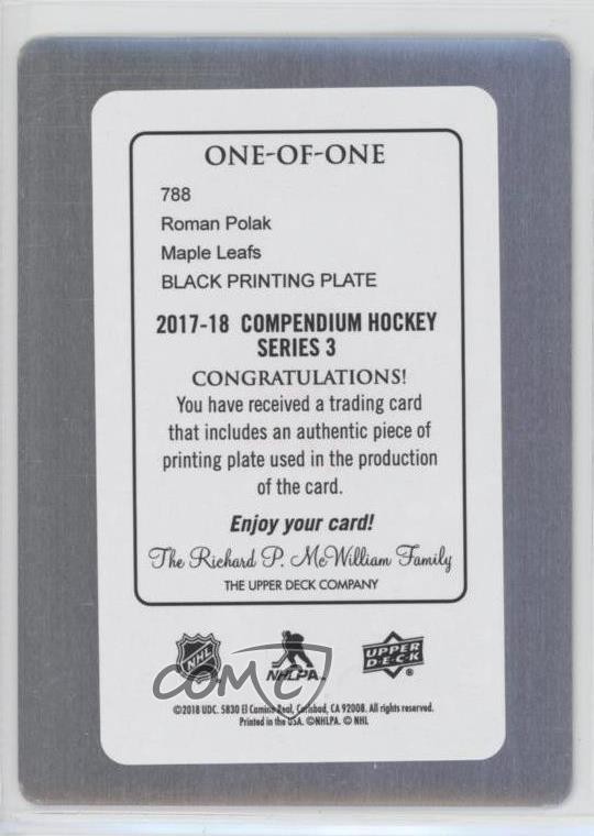 2017-18 Upper Deck Compendium - [Base] - Printing Plate Black #788 Roman Polak Serial #1/1 COMC Item: 50577127 - Ice Hockey Card - Featuring the Toronto Maple Leafs - Featuring Roman Polak Search for more: 2017-18 Upper Deck Compendium Search for more: 2017-18 Upper Deck Compendium - [Base] - Printing Plate Black View all of our Listings Auctions Buy It Now About Us Located in the beautiful Pacific Northwest, COMC (Check Out My Cards) is the world's largest consignment service for trading card singles. More than 10,000 people have used our consignment service to list over 50 million trading cards. Find out how we can help you consign your items on eBay by contacting us through eBay messaging. COMC -- "The Safe & Easy Way to Buy & Sell" Raw Condition for Modern Cards Unless otherwise noted, raw modern cards are listed in Near Mint-Mint condition or better. A NM-MT card appears to be Mint at first glance, but upon closer inspection, may exhibit some of the following: minor print defects (e.g. roller marks, print line, dimple), minor scratches, slight edge wear, and slight corner wear. Centering is clearly visible in the images provided and does not factor into our condition assessment. Raw Condition for Vintage Cards Unless otherwise noted, raw vintage cards are listed in Excellent condition or better. An EX card may exhibit some of the following: minor rounding of corners, surface wear, print defects, light scratches, and slight edge wear/chipping. Centering is clearly visible in the images provided and does not factor into our condition assessment. Domestic Shipping Combined shipping for multiple items is available. To receive combined shipping, please ensure all desired items are in your eBay shopping cart before proceeding to checkout. eBay limits orders to 40 items per order. We automatically combine multiple orders placed on the same day. If you place multiple orders on the same day, please contact us to request a refund of applicable shipping costs. Signature confirmation may be required on invoices over $400. All cards are protected and shipped securely. International Shipping COMC offers eBay's International Shipping (EIS) for international orders under $2,500* (see country exceptions below). All duties and import fees are paid at checkout; in the rare event that there are additional import fees upon delivery, these are borne by the buyer. EIS packages route through a shipping hub in Erlanger, KY before shipping to their final destination. Please note that EIS does not allow for combined shipments. The shipping rates are determined by eBay and cannot be adjusted. *Maximum sale price exceptions: Colombia, Kuwait ($2,000); Taiwan ($1,539); Chile, Costa Rica, Guatemala, Honduras, Trinidad and Tobago ($1,000); Antigua and Barbuda, Aruba, Belize, Dominica, Grenada, Philippines, Saint Kitts and Nevis, Saint Lucia, Montserrat, Turks and Caicos Islands ($500); Dominican Republic, El Salvador ($200). Please request a shipping quote through eBay messaging for orders that exceed the maximum sale price supported by eBay's International Shipping. You will be responsible for all duties and import fees for international orders shipped outside the EIS. All cards are protected and shipped securely. Payment COMC does not accept offers on our cards through our eBay storefront. COMC utilizes eBay’s managed payments system. If you are experiencing difficulties making a payment, please contact eBay for assistance. Return Policy Returns are only accepted on the rare occasion the item is not as described. If you are making a return, please initiate the return process through eBay so a mailing label can be provided for you. Prior to listing, our expert team carefully assessed this item to represent it accurately. Please review the description and high-definition images prior to purchasing to ensure this item meets your satisfaction. We welcome you to contact us if you have further questions about this item. Trust and Integrity COMC carefully assesses each item consigned to us to prevent fraudulent items from entering the marketplace. If you believe an item offered on COMC may be fraudulent, please contact us with details so we can investigate the issue. Items we determine are outside our supported items policy may be removed. Last Modified: 6/14/2025 3:57:16 AM PDT