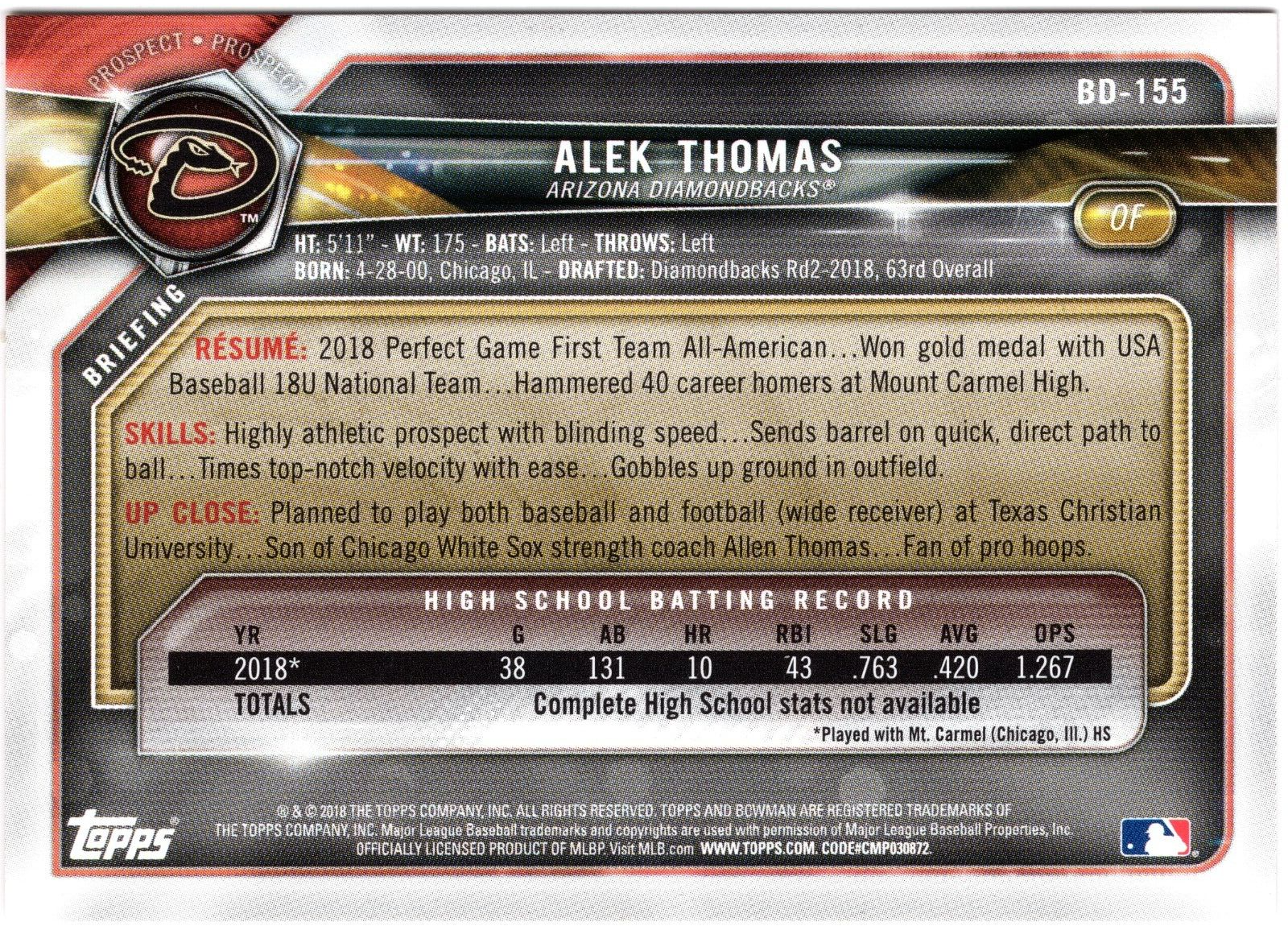 This 2018 Bowman trading card features Alek Thomas, a rookie player for the Arizona Diamondbacks, with card number BD-155. The card is made of card stock with a thickness of 35 Pt and measures standard size. It is part of the Major League (MLB) set and was manufactured by Bowman in the United States. The card is not autographed and has no mention of its condition. It is a great addition to any sports trading card collection, especially for fans of the Arizona Diamondbacks or Alek Thomas. The card's features include being a rookie and its association with the MLB World Series event/tournament. Don't miss out on the chance to own a piece of baseball history with this 2018 Bowman trading card.