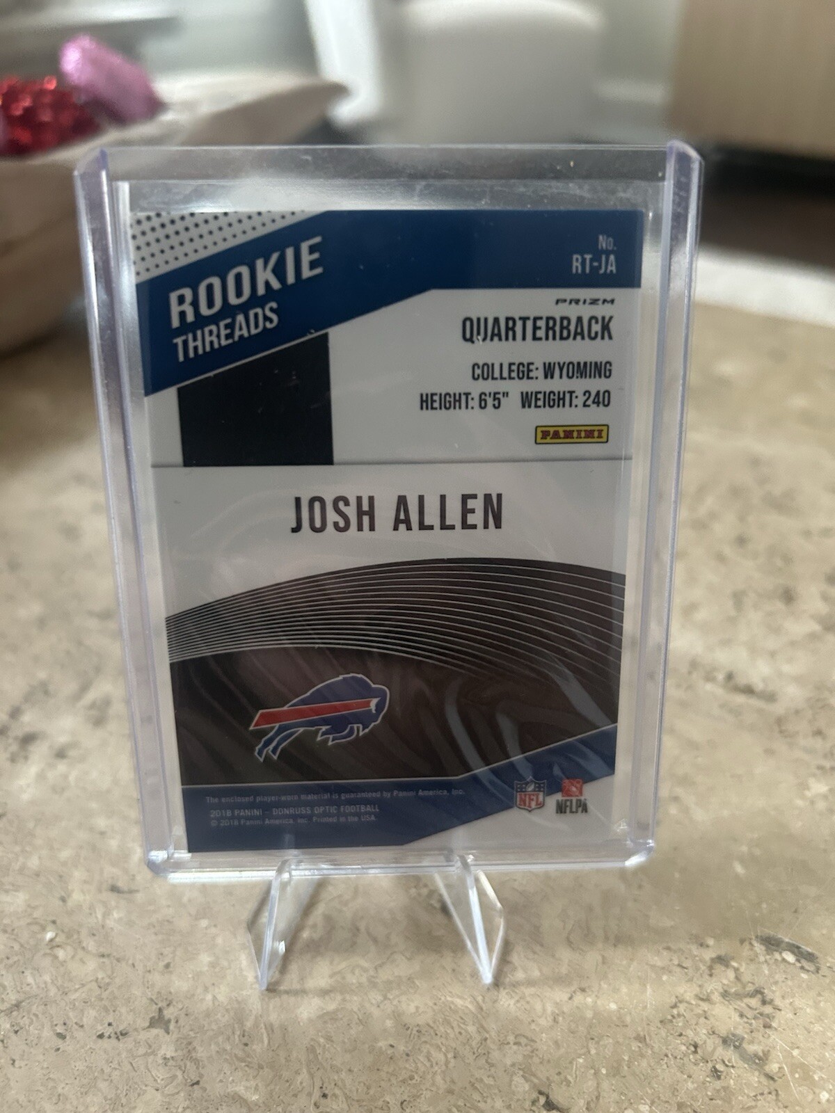 The 2018 Donruss Optic - Rookie Threads #RT-JA Josh Allen trading card features a memorabilia piece from Josh Allen, a rookie in the NFL. The card is in near mint or better condition, making it a desirable collectible for fans and collectors of sports trading cards. This card is part of the Rookie Threads series, which typically includes memorabilia cards of rookie players, adding to its appeal for those seeking unique and sought-after cards for their collection.