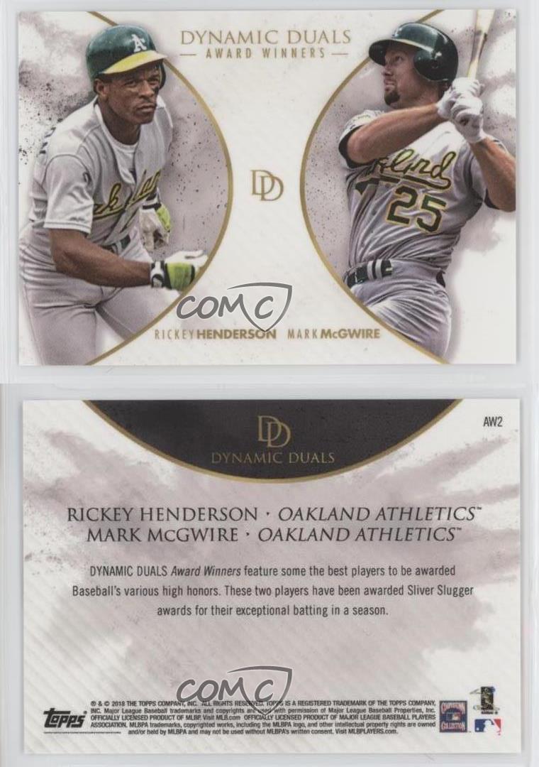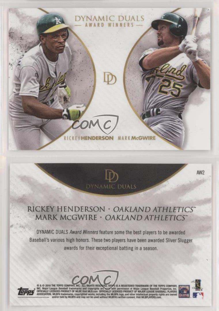 2018 Topps On Demand Dynamic Duals - [Base] #AW2 Award Winners - Rickey Henderson, Mark McGwire Qty Made: 700 - Baseball Card - Featuring the Oakland Athletics - Featuring Rickey Henderson and Mark McGwire Search for more: 2018 Topps On Demand Dynamic Duals Search for more: 2018 Topps On Demand Dynamic Duals - [Base] View all of our Listings Auctions Buy It Now About Us Located in the beautiful Pacific Northwest, COMC (Check Out My Cards) is the world's largest consignment service for trading card singles. More than 10,000 people have used our consignment service to list over 50 million trading cards. We currently house 20 million cards, each listed for sale with front and back images of the actual card. Find out how we can help you consign your items on eBay by contacting us through eBay messaging. COMC -- "The Safe & Easy Way to Buy & Sell" Representative Image - Select Specific Item above to see image of actual item Representative Image - Select Specific Item above to see image of actual item Raw Condition for Modern Cards Unless otherwise noted, raw modern cards are listed in Near Mint-Mint condition or better. A NM-MT card appears to be Mint at first glance, but upon closer inspection, may exhibit some of the following: minor print defects (e.g. roller marks, print line, dimple), minor scratches, slight edge wear, and slight corner wear. Centering is clearly visible in the images provided and does not factor into our condition assessment. Raw Condition for Vintage Cards Unless otherwise noted, raw vintage cards are listed in Excellent condition or better. An EX card may exhibit some of the following: minor rounding of corners, surface wear, print defects, light scratches, and slight edge wear/chipping. Centering is clearly visible in the images provided and does not factor into our condition assessment. Domestic Shipping Combined shipping for multiple items is available. To receive combined shipping, please ensure all desired items are in your eBay shopping cart before proceeding to checkout. eBay limits orders to 40 items per order. We automatically combine multiple orders placed on the same day. If you place multiple orders on the same day, please contact us to request a refund of applicable shipping costs. Signature confirmation may be required on invoices over $400. Raw cards are shipped in toploaders. International Shipping COMC offers eBay's International Shipping (EIS) for international orders under $2,500* (see country exceptions below). All duties and import fees are paid at checkout; in the rare event that there are additional import fees upon delivery, these are borne by the buyer. EIS packages route through a shipping hub in Erlanger, KY before shipping to their final destination. Please note that EIS does not allow for combined shipments. The shipping rates are determined by eBay and cannot be adjusted. *Maximum sale price exceptions: Colombia, Kuwait ($2,000); Taiwan ($1,539); Chile, Costa Rica, Guatemala, Honduras, Trinidad and Tobago ($1,000); Antigua and Barbuda, Aruba, Belize, Dominica, Grenada, Philippines, Saint Kitts and Nevis, Saint Lucia, Montserrat, Turks and Caicos Islands ($500); Dominican Republic, El Salvador ($200). Please request a shipping quote through eBay messaging for orders that exceed the maximum sale price supported by eBay's International Shipping. You will be responsible for all duties and import fees for international orders shipped outside the EIS. Raw cards are shipped in toploaders. Payment COMC does not accept offers on our cards through our eBay storefront. COMC utilizes eBay’s managed payments system. If you are experiencing difficulties making a payment, please contact eBay for assistance. Return Policy Returns are only accepted on the rare occasion the item is not as described. If you are making a return, please initiate the return process through eBay so a mailing label can be provided for you. Prior to listing, our expert team carefully assessed this item to represent it accurately. Please review the description and high-definition images prior to purchasing to ensure this item meets your satisfaction. We welcome you to contact us if you have further questions about this item. Trust and Integrity COMC carefully assesses each item consigned to us to prevent fraudulent items from entering the marketplace. If you believe an item offered on COMC may be fraudulent, please contact us with details so we can investigate the issue. Items we determine are outside our supported items policy may be removed. Last Modified: 1/5/2025 2:16:16 AM PDT