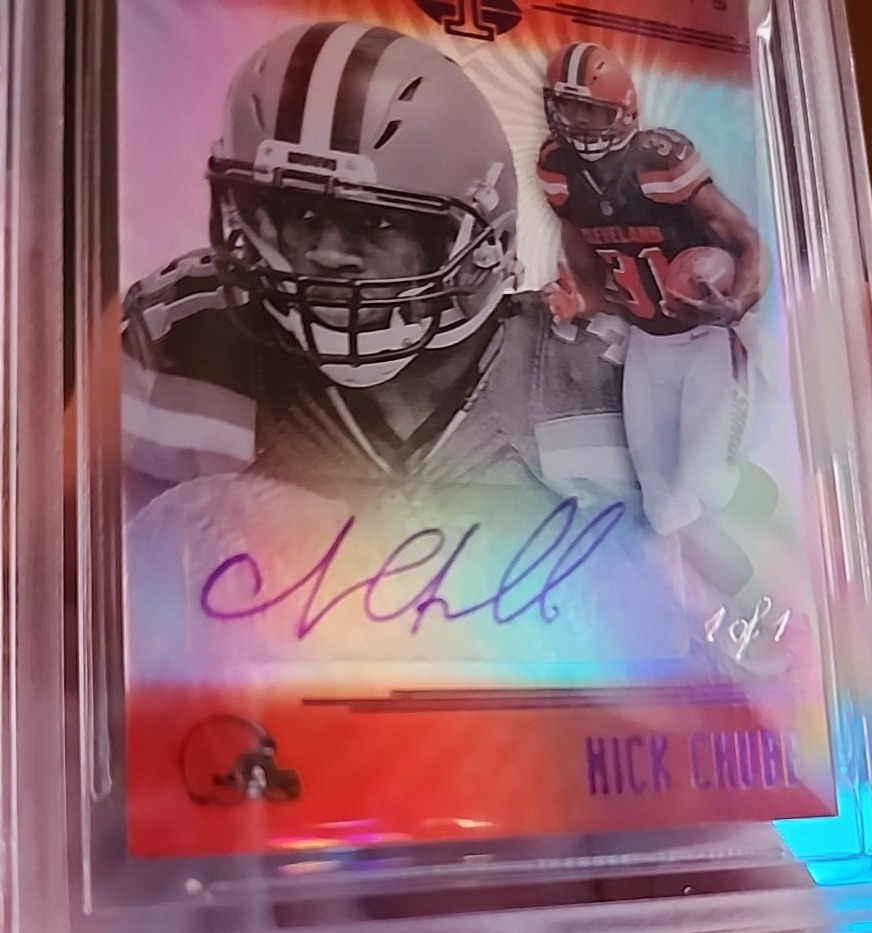 This is a 2018 Panini Illusions Rookie Endorsements Purple trading card featuring Nick Chubb, graded as GEM MINT 9.5 Auto 10. It is a 1/1 card , meaning it is a one-of-a-kind collectible item. The card is professionally graded and certified by Panini, making it a highly sought-after sports trading card for fans and collectors alike.
