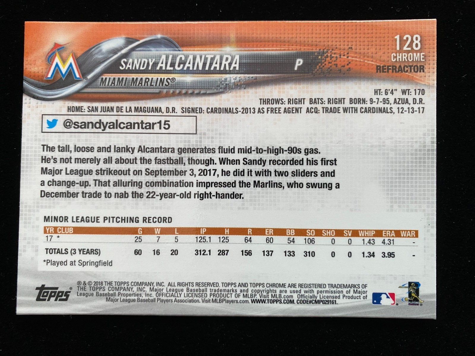 2018 Topps Chrome SANDY ALCANTARA Rookie SEPIA REFRACTOR #128 Miami Marlins RC SUPERSTAR ACE CY Young? All cards are at least NRMT unless noted. Some raw cards I list are potential GEM Mint Cards, but please note that all raw ungraded cards may contain pixelated dimples, scratches, printer lines, indents, edge chipping or corner whitening, along with other common condition issues. The card/s pictured in each listing is the card/s received, if you have condition questions please ask. If you're looking for guaranteed GEM MINT 10 cards then I suggest buying cards that are already graded. I will not accept returns under any circumstances, buying sports cards is similar to buying stocks and you cannot return stocks, so please do not try and return the card to me. Most are pulled by me directly from packs and immediately put into sleeves, I do not inspect every card for every potential flaw, so card/s could have no flaws. Card ships USPS, if the card sells for under $20 it will be shipped in PWE, if the card sells for more than $20 it will ship GROUND ADVANTAGE, regardless of S&H cost, I don't know how much the card is going to sell for before it's sold, so I'm just guessing. If auction ends for less than $20 and you would like me to ship in a bubble mailer, please let me know before paying for the auction and I will send an updated invoice. If Auction sells for more than $20 with a low S&H charge I will cover additional cost to ship. Combined shipping is available, at roughly one dollar per additional Listing, with a cap around $10 depending on weight.