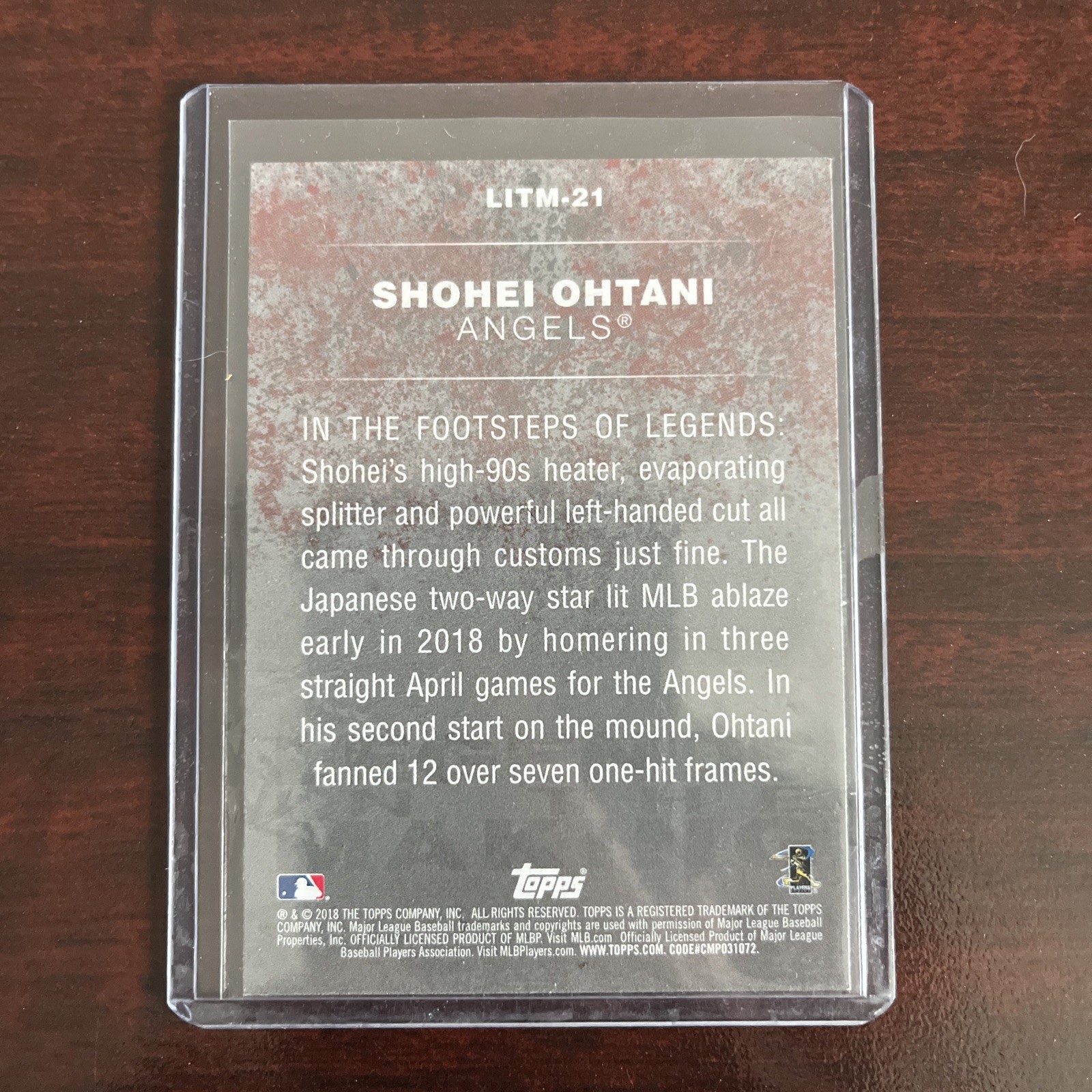 The 2018 Topps Update Series - Legends in the Making Shohei Ohtani #LITM-21 (RC) trading card is a collectible sports card featuring the talented baseball player Shohei Ohtani from the Los Angeles Angels. Manufactured by Topps, this card is part of the 2018 season release and showcases Ohtani as a rising star in the baseball world. As a sports trading card, it appeals to fans and collectors looking to own a piece of baseball history and celebrate the achievements of this promising athlete.