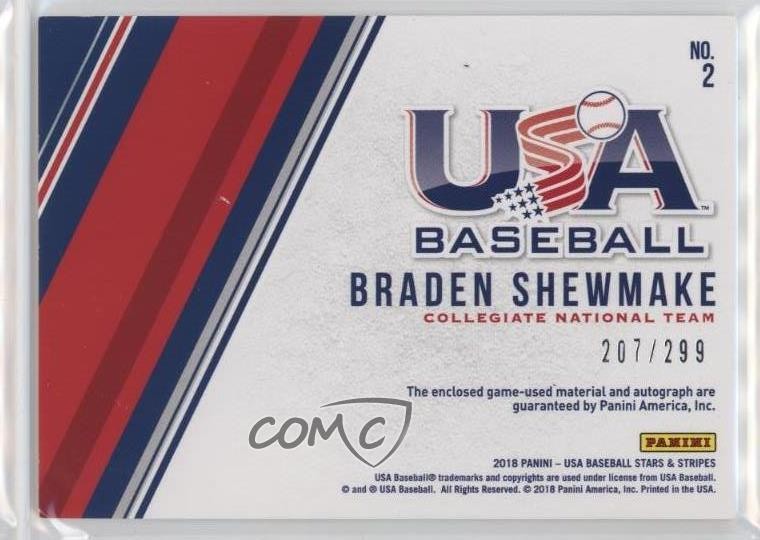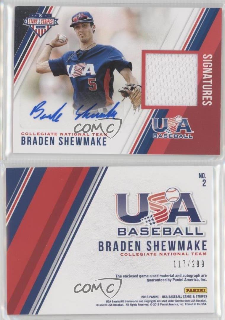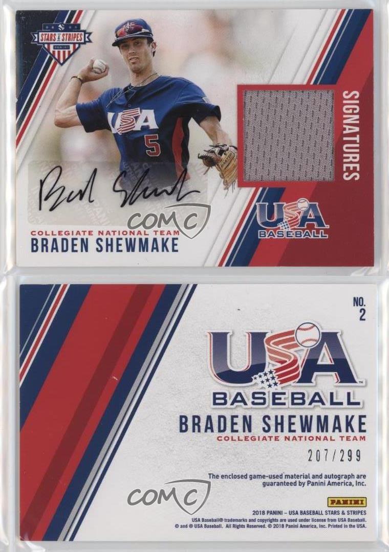 2018 Panini USA Baseball Stars & Stripes - Stars and Stripes Material Signatures #2 Braden Shewmake Qty Made: 299 - Rookie - Baseball Card - Featuring the USA Baseball Collegiate National Team - Featuring Braden Shewmake Search for more: 2018 Panini USA Baseball Stars & Stripes Search for more: 2018 Panini USA Baseball Stars & Stripes - Stars and Stripes Material Signatures View all of our Listings Auctions Buy It Now About Us Located in the beautiful Pacific Northwest, COMC (Check Out My Cards) is the world's largest consignment service for trading card singles. More than 10,000 people have used our consignment service to list over 50 million trading cards. Find out how we can help you consign your items on eBay by contacting us through eBay messaging. COMC -- "The Safe & Easy Way to Buy & Sell" Representative Image - Select Specific Item above to see image of actual item Representative Image - Select Specific Item above to see image of actual item Raw Condition for Modern Cards Unless otherwise noted, raw modern cards are listed in Near Mint-Mint condition or better. A NM-MT card appears to be Mint at first glance, but upon closer inspection, may exhibit some of the following: minor print defects (e.g. roller marks, print line, dimple), minor scratches, slight edge wear, and slight corner wear. Centering is clearly visible in the images provided and does not factor into our condition assessment. Raw Condition for Vintage Cards Unless otherwise noted, raw vintage cards are listed in Excellent condition or better. An EX card may exhibit some of the following: minor rounding of corners, surface wear, print defects, light scratches, and slight edge wear/chipping. Centering is clearly visible in the images provided and does not factor into our condition assessment. Domestic Shipping Combined shipping for multiple items is available. To receive combined shipping, please ensure all desired items are in your eBay shopping cart before proceeding to checkout. eBay limits orders to 40 items per order. We automatically combine multiple orders placed on the same day. If you place multiple orders on the same day, please contact us to request a refund of applicable shipping costs. Signature confirmation may be required on invoices over $400. All cards are protected and shipped securely. International Shipping COMC offers eBay's International Shipping (EIS) for international orders under $2,500* (see country exceptions below). All duties and import fees are paid at checkout; in the rare event that there are additional import fees upon delivery, these are borne by the buyer. EIS packages route through a shipping hub in Erlanger, KY before shipping to their final destination. Please note that EIS does not allow for combined shipments. The shipping rates are determined by eBay and cannot be adjusted. *Maximum sale price exceptions: Colombia, Kuwait ($2,000); Taiwan ($1,539); Chile, Costa Rica, Guatemala, Honduras, Trinidad and Tobago ($1,000); Antigua and Barbuda, Aruba, Belize, Dominica, Grenada, Philippines, Saint Kitts and Nevis, Saint Lucia, Montserrat, Turks and Caicos Islands ($500); Dominican Republic, El Salvador ($200). Please request a shipping quote through eBay messaging for orders that exceed the maximum sale price supported by eBay's International Shipping. You will be responsible for all duties and import fees for international orders shipped outside the EIS. All cards are protected and shipped securely. Payment COMC does not accept offers on our cards through our eBay storefront. COMC utilizes eBay’s managed payments system. If you are experiencing difficulties making a payment, please contact eBay for assistance. Return Policy Returns are only accepted on the rare occasion the item is not as described. If you are making a return, please initiate the return process through eBay so a mailing label can be provided for you. Prior to listing, our expert team carefully assessed this item to represent it accurately. Please review the description and high-definition images prior to purchasing to ensure this item meets your satisfaction. We welcome you to contact us if you have further questions about this item. Trust and Integrity COMC carefully assesses each item consigned to us to prevent fraudulent items from entering the marketplace. If you believe an item offered on COMC may be fraudulent, please contact us with details so we can investigate the issue. Items we determine are outside our supported items policy may be removed. Last Modified: 7/7/2025 5:45:11 AM PDT