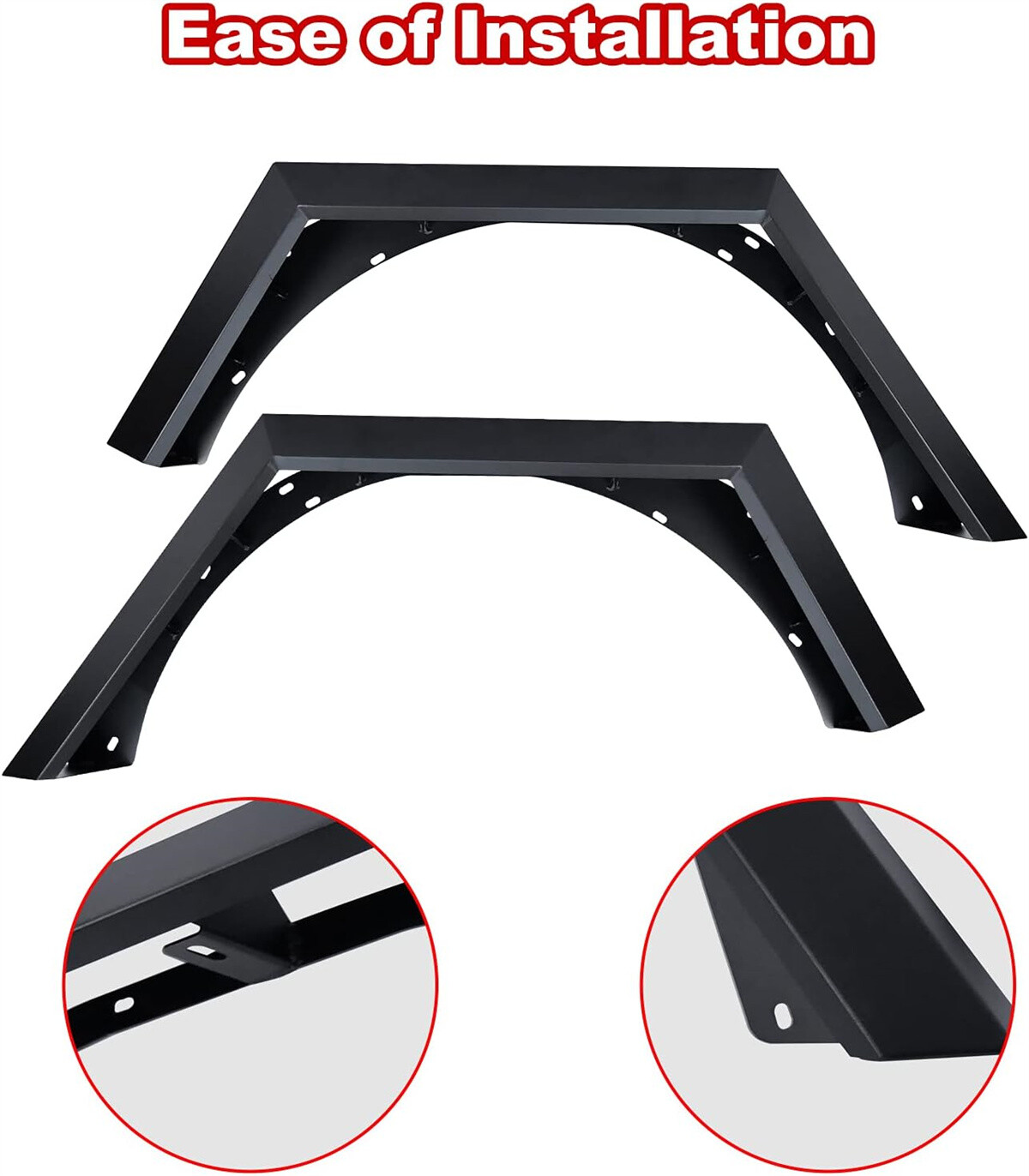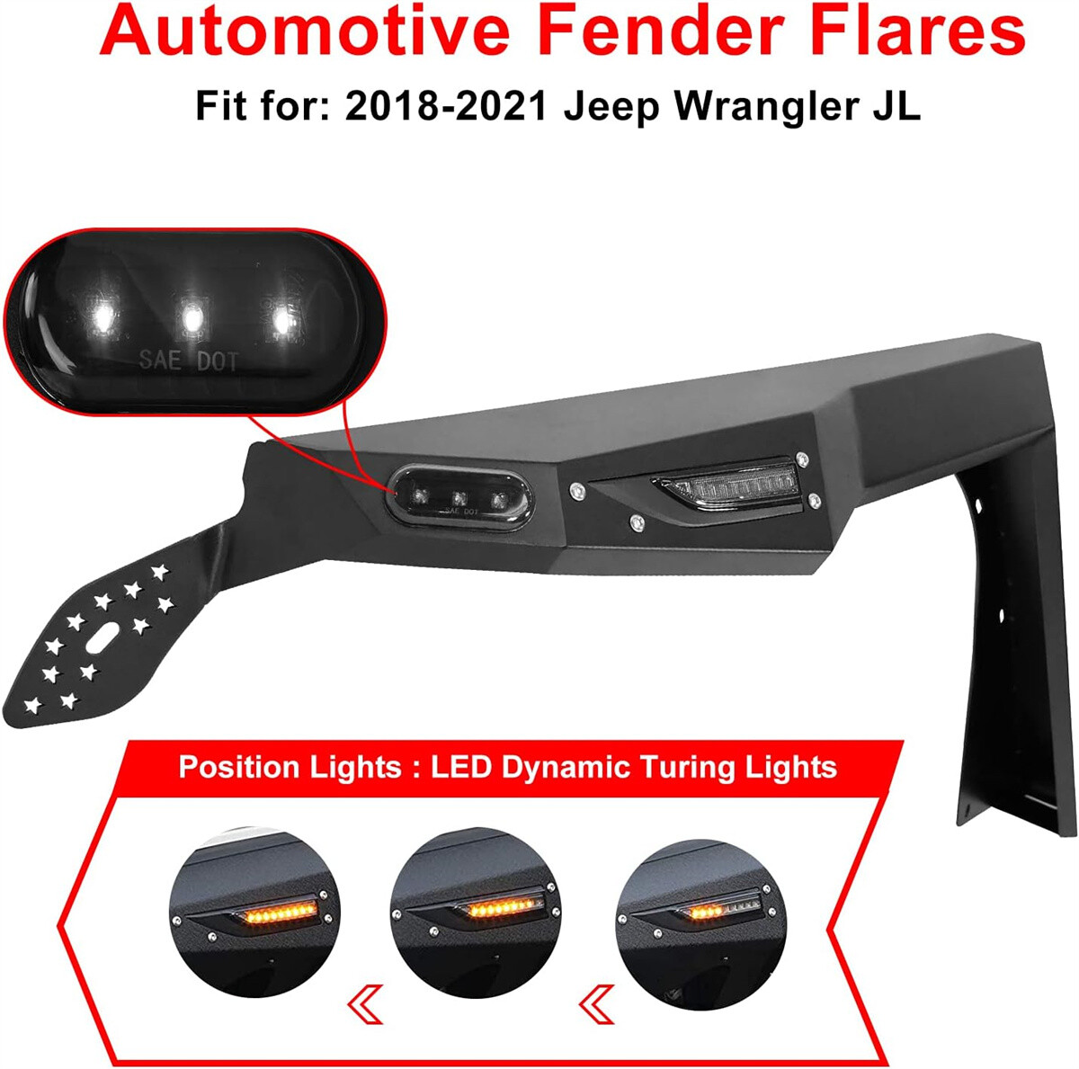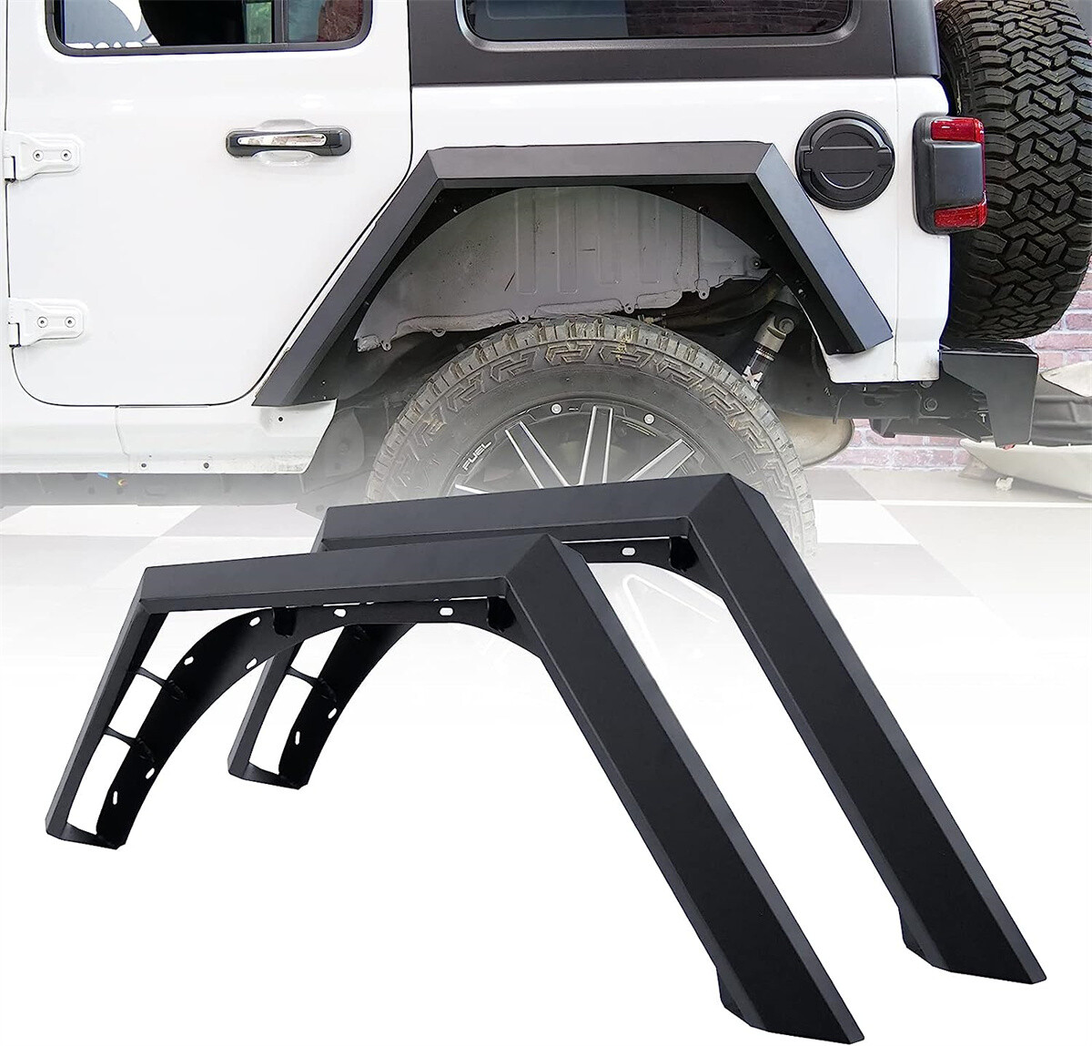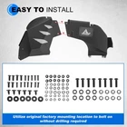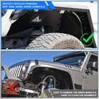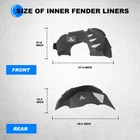 Inner Fenders Liners Features 1 Pair of Front & Rear Inner Fenders - A set of front & rear inner fenders for your Jeep Wrangler JL 2DR, 4DR and Gladiator JT. Stylish Vent Design - Allows for heat dissipation and a peek inside the inner workings of your vehicle. Easy Access - Reach the Jeep's shocks with ease, and totally protect your vehicle from mud and debris getting in the engine bay. Heavy Duty Build - Cold rolled steel with a textured black powder coat for corrosion protection and durability. 100% Brand New in the box with manufacturer packaging, never been opened or installed before. Designed in USA Fitment Compatible for 2018-2021 Jeep Wrangler JL 2DR, 4DR & Gladiator JT Package Includes 2 * Front Inner Fenders Liners 2 * Rear Inner Fenders Liners 1 * set of Mounting Accessories After-sales Service 1 year manufacturer warranty. 30-Day return policy. Fender Flares Features: Multifunctional design - Equipped with LED sequential turn signal lights and LED side marker lights (LED lights with DOT & SAE compliance for street use) 1 pair front and rear - a full set of fender flares for your Jeep Wrangler JL. Heavy duty build - Heavy Duty steel construction with black powder coat finish process. Easy installation - package includes installation manual for your reference, direct bolt-on installation. 1 year manufacturer warranty. 30-Day return policy. Specification: Material: Textured Black Powder Coated Steel Features: Mounting Hardware Included Product Weight: 43.43 lbs Product Dimensions: Front : 43.99 x 21.57 Inches; Rear : 46.49 x 18.23 Inches Fitment: 2018 2019 2020 2021 2022 2023 Jeep Wrangler JL 2 Door & 4 Door Package Included: 1* Pair of Front Fender Flares 1* Pair of Rear Fender Flares 1* Set of Mounting Accessories 1* Installation Manual