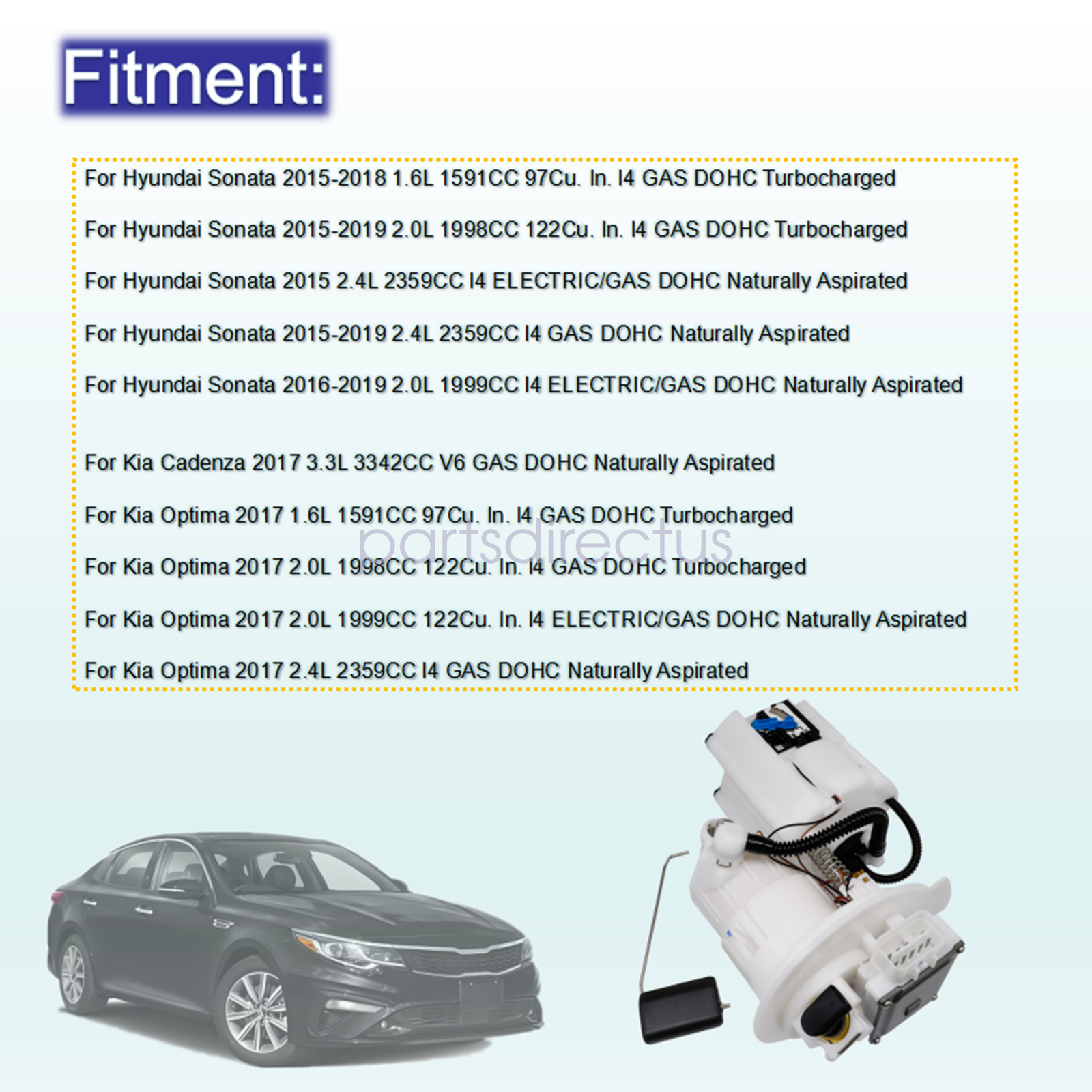 Fuel Pump Module 31110-C2500 For Kia Optima EX Sedan 4-Door 2019 1.6L 2.4L ▶ Fast & Free Shipping From KY or CA. ▶ Warranty: 1 Year ▶ 100% New & 100% Tested & Fast Free Shipping ▶ simply direct replacement,Easy Installation,Plug and Play Compatible with : For Hyundai Sonata 2015-2018 1.6L 1591CC 97Cu. In. l4 GAS DOHC Turbocharged For Hyundai Sonata 2015-2019 2.0L 1998CC 122Cu. In. l4 GAS DOHC Turbocharged For Hyundai Sonata 2015 2.4L 2359CC l4 ELECTRIC/GAS DOHC Naturally Aspirated For Hyundai Sonata 2015-2019 2.4L 2359CC l4 GAS DOHC Naturally Aspirated For Hyundai Sonata 2016-2019 2.0L 1999CC l4 ELECTRIC/GAS DOHC Naturally Aspirated For Kia Cadenza 2017 3.3L 3342CC V6 GAS DOHC Naturally Aspirated For Kia Optima 2017 1.6L 1591CC 97Cu. In. l4 GAS DOHC Turbocharged For Kia Optima 2017 2.0L 1998CC 122Cu. In. l4 GAS DOHC Turbocharged For Kia Optima 2017 2.0L 1999CC 122Cu. In. l4 ELECTRIC/GAS DOHC Naturally Aspirated For Kia Optima 2017 2.4L 2359CC l4 GAS DOHC Naturally Aspirated Part number: for 31110-D5500 31110-C2500 31111-C1100 Item included: 1PCS Fuel Pump Module Please Note: No Instructions Included.Professional Installation Is Highly Recommended ! If you are unsure of the item, please contact us before buying to avoid unnecessary return! Please Check the Part Number and Compare with Pictures Provided Carefully Before Purchasing to Ensure It Is The Correct Product You Need, Any Questions Please Contact Us. General Policies Dear customer,if you have any questions,you can contact us,we will provide the best service for you. Shipping policy: The item will be shipped within 24 hours on payment received except the holidays.(except weekends & official holidays). You can log on to eBay to check your logistics tracking number. Shipped via USPS or FedEx (depending on location and package weight) Please confirm address before purchase, and cannot change address once purchased. If you need to receive the item quickly, please contact us, you can pay the postage to choose other logistics. Payment: Please purchase and pay for the item through the eBay,only accpected the paypal payment. Returns: Please contact us first when return, exchange and refund is required. Any direct return of purchased items will not be processed. If the product is defective or damage upon arrival,please contact us immediately,we will provide the solve the problem. Returns accepted within 30 days of delivery date and item must be in new condition. When returning an item, it must be in all of the packaging and include all of the accessories or items that came with it. The item and package should be in and perfect condition. About us: Our goal is complete customer satisfaction. We will be very honored to provide you with quality service. Our products are a 100% authentic and brand new. We work with the biggest suppliers of high quality products to bring you only the best items. No customer will walk away from our store unhappy. If there’s a problem, just let us know and we fix it. On Mar 16, 2025 at 08:04:10 PDT, seller added the following information: