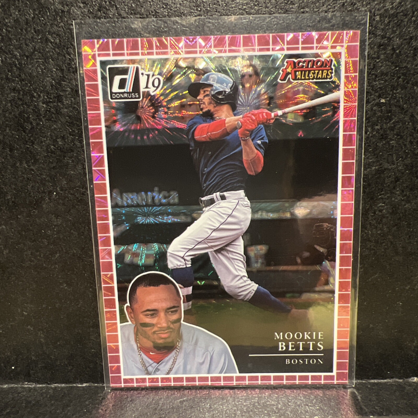 The product is a 2019 trading card lot featuring Mookie Betts of the Boston Red Sox. It includes cards from the Donruss Optic, Donruss Baseball, and Score sets, with a total of 3 cards. The cards are in English and manufactured by Panini, with features like inserts and parallels. The cards are original and not autographed, made of card stock, and pertain to the 2018 MLB season. (PWE#2716)