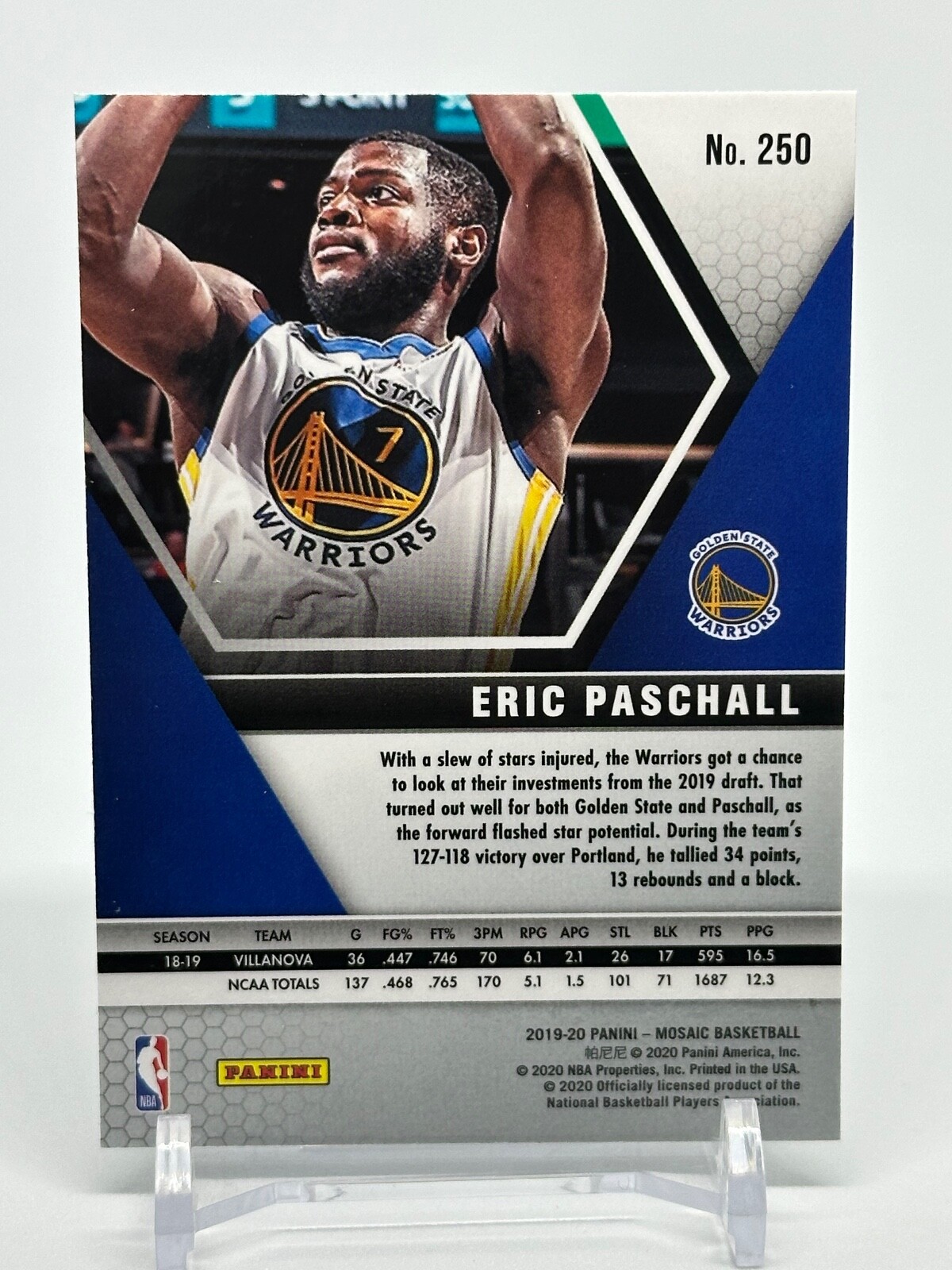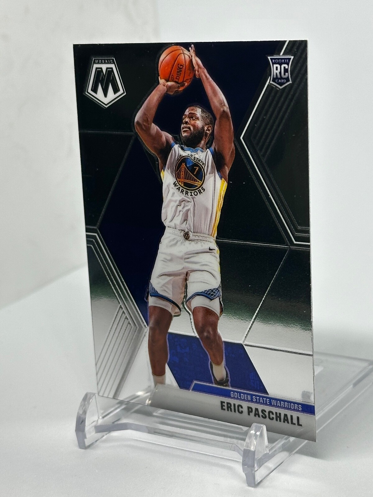 This 2019 Panini Mosaic #250 Eric Paschall Rookie Warriors Basketball trading card is a must-have for any sports fan or collector. The card features the Golden State Warriors player in action during the 2019 season of the National Basketball Association (NBA). With its Standard size and Mosaic parallel/variety, this English language card is a great addition to any sports trading card collection. It is manufactured by Panini, a well-known and respected name in the industry. Don't miss out on the opportunity to own this unique and rare piece of basketball history.