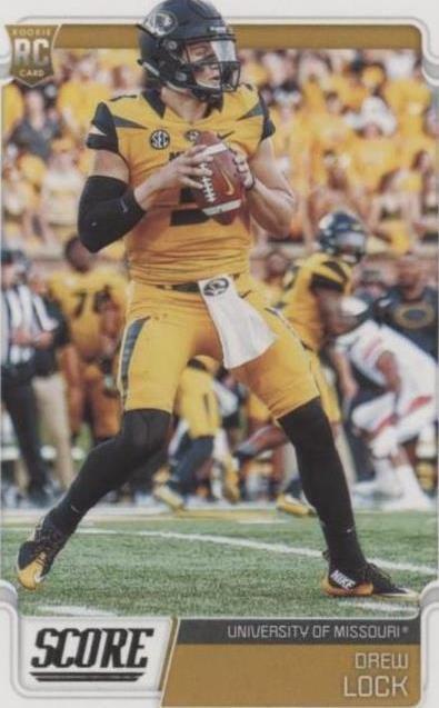 Additional Description:Rookies - Drew LockPlayer/Athlete:Drew LockCard Number:334Features:Rookie, Base SetSeries:ScoreSubset:RookiesLeague:National Collegiate Athletic Association (NCAA), National Football League (NFL)Season:2019Set:2019 Scorebrand:PaniniSport:FootballParallel/Variety:[Base]Manufacturer:PaniniTeam:Missouri Tigers