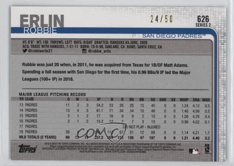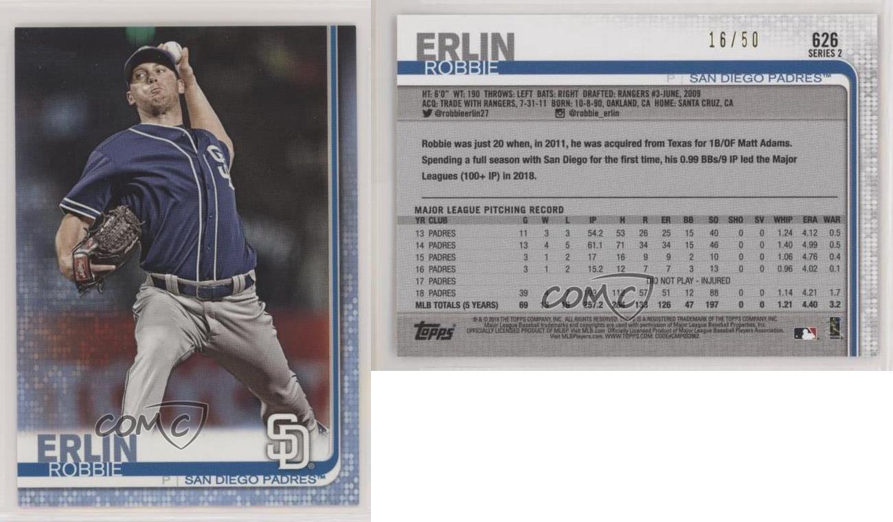 2019 Topps - [Base] - Father's Day Blue #626 Robbie Erlin Qty Made: 50 - Baseball Card - Featuring the San Diego Padres - Featuring Robbie Erlin Search for more: 2019 Topps Search for more: 2019 Topps - [Base] - Father's Day Blue View all of our Listings Auctions Buy It Now About Us Located in the beautiful Pacific Northwest, COMC (Check Out My Cards) is the world's largest consignment service for trading card singles. More than 10,000 people have used our consignment service to list over 50 million trading cards. Find out how we can help you consign your items on eBay by contacting us through eBay messaging. COMC -- "The Safe & Easy Way to Buy & Sell" Representative Image - Select Specific Item above to see image of actual item Representative Image - Select Specific Item above to see image of actual item Raw Condition for Modern Cards Unless otherwise noted, raw modern cards are listed in Near Mint-Mint condition or better. A NM-MT card appears to be Mint at first glance, but upon closer inspection, may exhibit some of the following: minor print defects (e.g. roller marks, print line, dimple), minor scratches, slight edge wear, and slight corner wear. Centering is clearly visible in the images provided and does not factor into our condition assessment. Raw Condition for Vintage Cards Unless otherwise noted, raw vintage cards are listed in Excellent condition or better. An EX card may exhibit some of the following: minor rounding of corners, surface wear, print defects, light scratches, and slight edge wear/chipping. Centering is clearly visible in the images provided and does not factor into our condition assessment. Domestic Shipping Combined shipping for multiple items is available. To receive combined shipping, please ensure all desired items are in your eBay shopping cart before proceeding to checkout. eBay limits orders to 40 items per order. We automatically combine multiple orders placed on the same day. If you place multiple orders on the same day, please contact us to request a refund of applicable shipping costs. Signature confirmation may be required on invoices over $400. All cards are protected and shipped securely. International Shipping COMC offers eBay's International Shipping (EIS) for international orders under $2,500* (see country exceptions below). All duties and import fees are paid at checkout; in the rare event that there are additional import fees upon delivery, these are borne by the buyer. EIS packages route through a shipping hub in Erlanger, KY before shipping to their final destination. Please note that EIS does not allow for combined shipments. The shipping rates are determined by eBay and cannot be adjusted. *Maximum sale price exceptions: Colombia, Kuwait ($2,000); Taiwan ($1,539); Chile, Costa Rica, Guatemala, Honduras, Trinidad and Tobago ($1,000); Antigua and Barbuda, Aruba, Belize, Dominica, Grenada, Philippines, Saint Kitts and Nevis, Saint Lucia, Montserrat, Turks and Caicos Islands ($500); Dominican Republic, El Salvador ($200). Please request a shipping quote through eBay messaging for orders that exceed the maximum sale price supported by eBay's International Shipping. You will be responsible for all duties and import fees for international orders shipped outside the EIS. All cards are protected and shipped securely. Payment COMC does not accept offers on our cards through our eBay storefront. COMC utilizes eBay’s managed payments system. If you are experiencing difficulties making a payment, please contact eBay for assistance. Return Policy Returns are only accepted on the rare occasion the item is not as described. If you are making a return, please initiate the return process through eBay so a mailing label can be provided for you. Prior to listing, our expert team carefully assessed this item to represent it accurately. Please review the description and high-definition images prior to purchasing to ensure this item meets your satisfaction. We welcome you to contact us if you have further questions about this item. Trust and Integrity COMC carefully assesses each item consigned to us to prevent fraudulent items from entering the marketplace. If you believe an item offered on COMC may be fraudulent, please contact us with details so we can investigate the issue. Items we determine are outside our supported items policy may be removed. Last Modified: 7/13/2025 8:46:27 AM PDT
