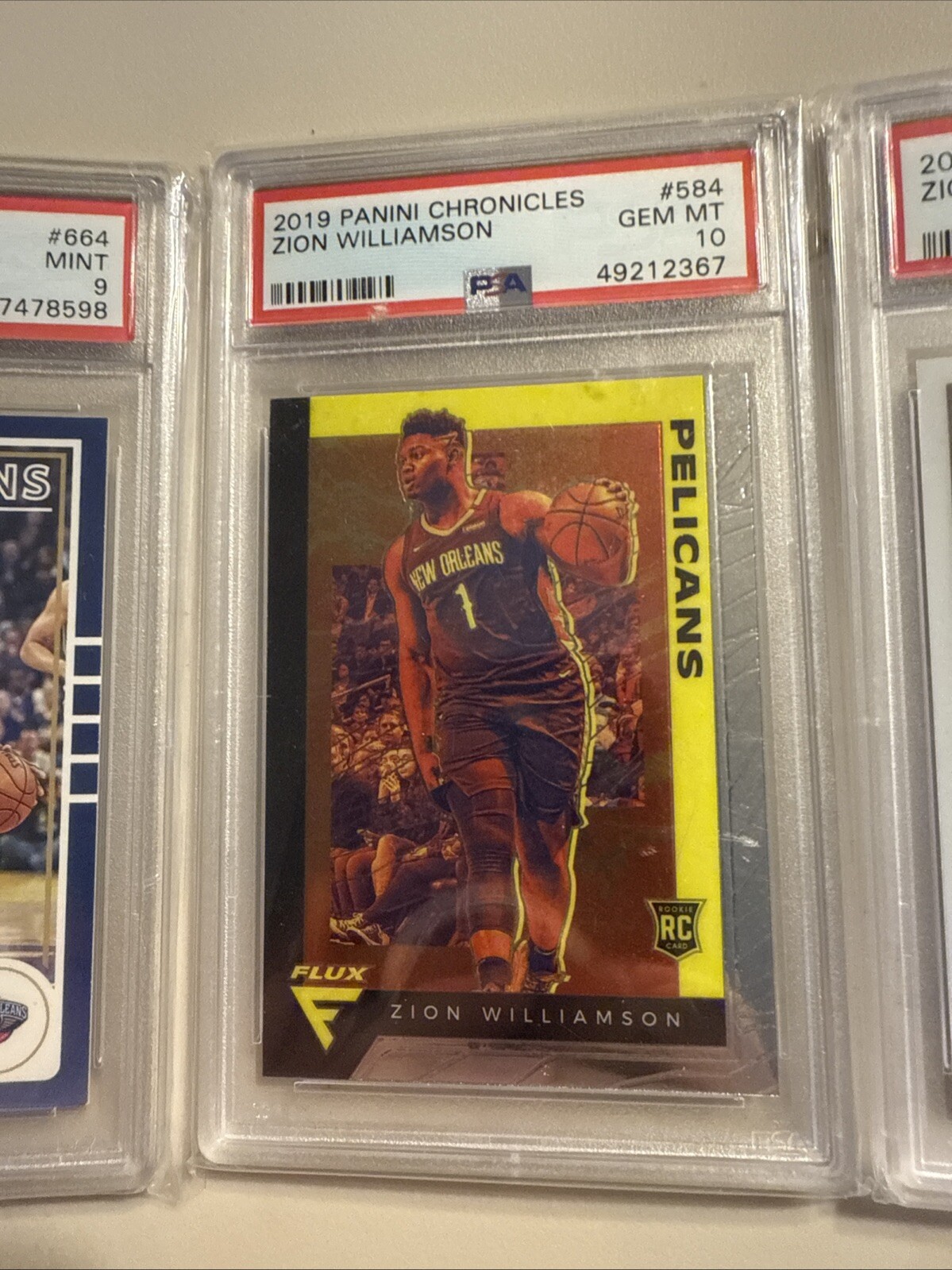 The product is a 2019 Panini Donruss Optic trading card featuring Zion Williamson, a rookie player from Duke Blue Devils and New Orleans Pelicans in the NBA. The card is numbered 158 and has been graded as a PSA 9, indicating it is in mint condition. This card is part of a lot of Zion Williamson cards from the 2019-20 season, offering collectors the chance to own a piece of memorabilia from this highly sought-after basketball player. 4 cards total 2019 Chronicles Rookie Card - psa 9 2019 Flux Rookie Card - psa 10 2019 Donruss Optic Rated Rookie - psa 9 2019 Hoops Rookie - psa 9