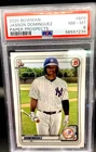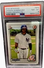 This 2020 Bowman trading card features rookie Jasson Dominguez of the New York Yankees. The card is part of the Bowman Chrome series and is a 1st Bowman parallel/variety. It has been professionally graded PSA 8, making it a highly sought-after piece for any baseball card collector. The card is in excellent condition and has not been autographed. It is an original, not a licensed reprint, This single trading card is a must-have for fans of Jasson Dominguez and the New York Yankees. You're buying the card as is.