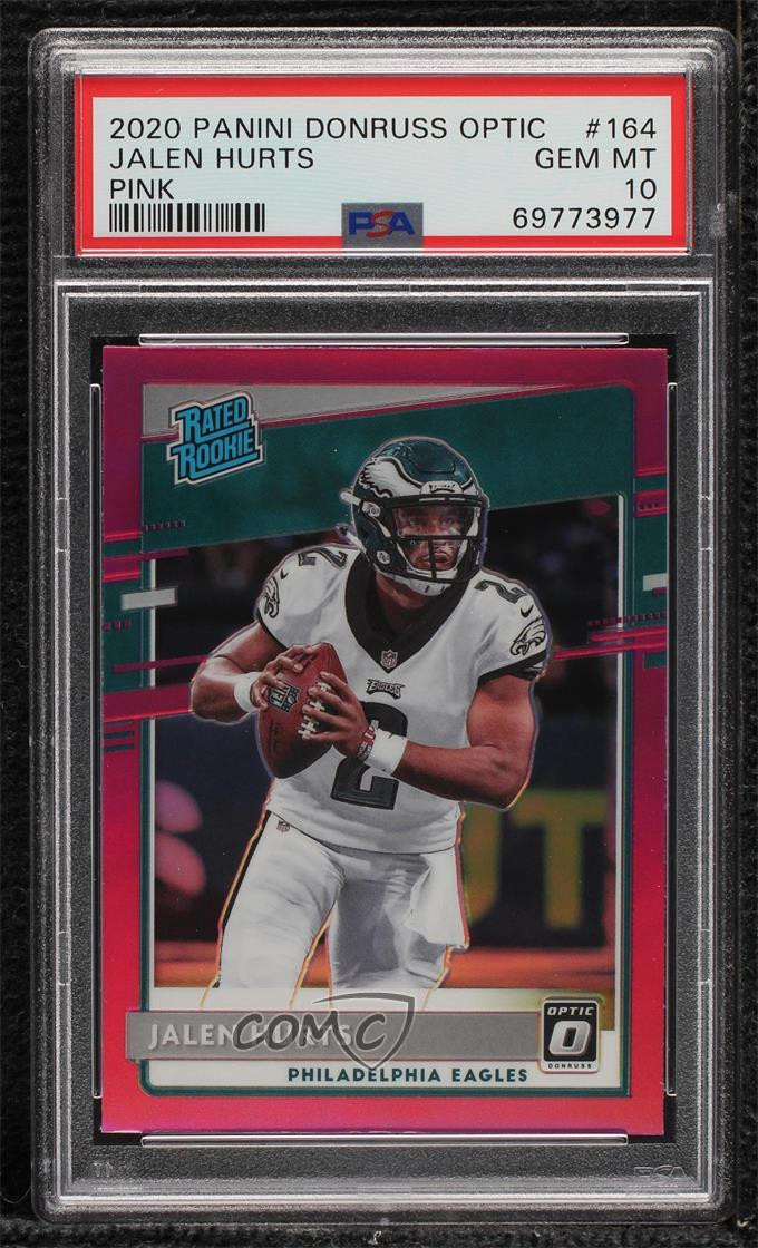 2020 Panini Donruss Optic - [Base] - Pink Prizm #164 Rated Rookies - Jalen Hurts Graded PSA 10 GEM MT - RC (Rookie Card) - Football Card - Featuring the Philadelphia Eagles - Featuring Jalen Hurts Search for more: 2020 Panini Donruss Optic Search for more: 2020 Panini Donruss Optic - [Base] - Pink Prizm View all of our Listings Auctions Buy It Now About Us Located in the beautiful Pacific Northwest, COMC (Check Out My Cards) is the world's largest consignment service for trading card singles. More than 10,000 people have used our consignment service to list over 50 million trading cards. Find out how we can help you consign your items on eBay by contacting us through eBay messaging. COMC -- "The Safe & Easy Way to Buy & Sell" Representative Image - Select Specific Item above to see image of actual item Representative Image - Select Specific Item above to see image of actual item Raw Condition for Modern Cards Unless otherwise noted, raw modern cards are listed in Near Mint-Mint condition or better. A NM-MT card appears to be Mint at first glance, but upon closer inspection, may exhibit some of the following: minor print defects (e.g. roller marks, print line, dimple), minor scratches, slight edge wear, and slight corner wear. Centering is clearly visible in the images provided and does not factor into our condition assessment. Raw Condition for Vintage Cards Unless otherwise noted, raw vintage cards are listed in Excellent condition or better. An EX card may exhibit some of the following: minor rounding of corners, surface wear, print defects, light scratches, and slight edge wear/chipping. Centering is clearly visible in the images provided and does not factor into our condition assessment. Domestic Shipping Combined shipping for multiple items is available. To receive combined shipping, please ensure all desired items are in your eBay shopping cart before proceeding to checkout. eBay limits orders to 40 items per order. We automatically combine multiple orders placed on the same day. If you place multiple orders on the same day, please contact us to request a refund of applicable shipping costs. Signature confirmation may be required on invoices over $400. All cards are protected and shipped securely. International Shipping COMC offers eBay's International Shipping (EIS) for international orders under $2,500* (see country exceptions below). All duties and import fees are paid at checkout; in the rare event that there are additional import fees upon delivery, these are borne by the buyer. EIS packages route through a shipping hub in Erlanger, KY before shipping to their final destination. Please note that EIS does not allow for combined shipments. The shipping rates are determined by eBay and cannot be adjusted. *Maximum sale price exceptions: Colombia, Kuwait ($2,000); Taiwan ($1,539); Chile, Costa Rica, Guatemala, Honduras, Trinidad and Tobago ($1,000); Antigua and Barbuda, Aruba, Belize, Dominica, Grenada, Philippines, Saint Kitts and Nevis, Saint Lucia, Montserrat, Turks and Caicos Islands ($500); Dominican Republic, El Salvador ($200). Please request a shipping quote through eBay messaging for orders that exceed the maximum sale price supported by eBay's International Shipping. You will be responsible for all duties and import fees for international orders shipped outside the EIS. All cards are protected and shipped securely. Payment COMC does not accept offers on our cards through our eBay storefront. COMC utilizes eBay’s managed payments system. If you are experiencing difficulties making a payment, please contact eBay for assistance. Return Policy Returns are only accepted on the rare occasion the item is not as described. If you are making a return, please initiate the return process through eBay so a mailing label can be provided for you. Prior to listing, our expert team carefully assessed this item to represent it accurately. Please review the description and high-definition images prior to purchasing to ensure this item meets your satisfaction. We welcome you to contact us if you have further questions about this item. Trust and Integrity COMC carefully assesses each item consigned to us to prevent fraudulent items from entering the marketplace. If you believe an item offered on COMC may be fraudulent, please contact us with details so we can investigate the issue. Items we determine are outside our supported items policy may be removed. Last Modified: 3/1/2025 12:31:23 PM PDT