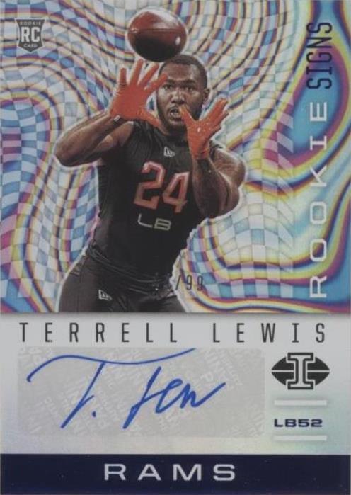The product is a 2020 Panini Illusions Rookie Signs trading card featuring Terrell Lewis of the Los Angeles Rams. This particular card is a Blue parallel with a print run of only 99, making it a rare and collectible item for NFL fans and card collectors alike. The card is serial numbered and part of an insert set dedicated to rookie players, adding to its appeal as a sought-after piece for fans of the sport.