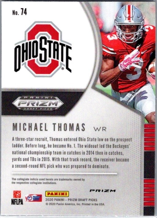 Elevate your sports card collection with the 2020 Panini Prizm Draft Michael Thomas #74 Blue Prizm card. This sought-after trading card features the standout wide receiver from the Ohio State Buckeyes, capturing the essence of his dynamic athleticism in a collectible format. As part of the 2020 Panini Prizm Draft series, this card is a must-have for enthusiasts and collectors alike, boasting the desirable Blue Prizm parallel that sets it apart from the base set. Carefully crafted by Panini, the card's number 74 signifies its place within the series, and the attention to detail reflects the manufacturer's commitment to quality. Whether you're a fan of college football, an admirer of Michael Thomas's impressive career, or a connoisseur of rare sports memorabilia, this Blue Prizm card is a noteworthy addition to any collection.