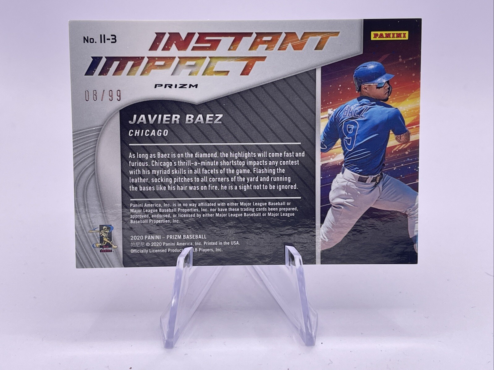 The 2020 Panini Prizm Javier Báez Red Wave /99 card features the Chicago Cubs player in the Major League Baseball (MLB). This sports trading card is from the Instant Impact subset and is a parallel variety with a red wave design. The card is serial numbered out of 99 and in near mint or better condition. It is an original release manufactured by Panini for the 2020 season.