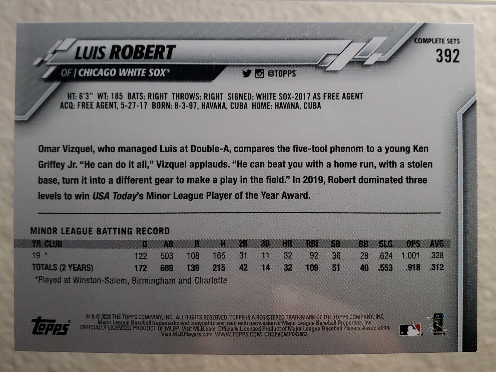 Season:2020Sport:BaseballCard Number:392Set:2020 ToppsSeries:ToppsLeague:Major League Baseball (MLB)Features:Rookie, Base SetTeam:Chicago White SoxAdditional Description:Luis Robert (Batting)Player/Athlete:Luis Robertbrand:ToppsVariation Description:BattingParallel/Variety:[Base]Manufacturer:Topps