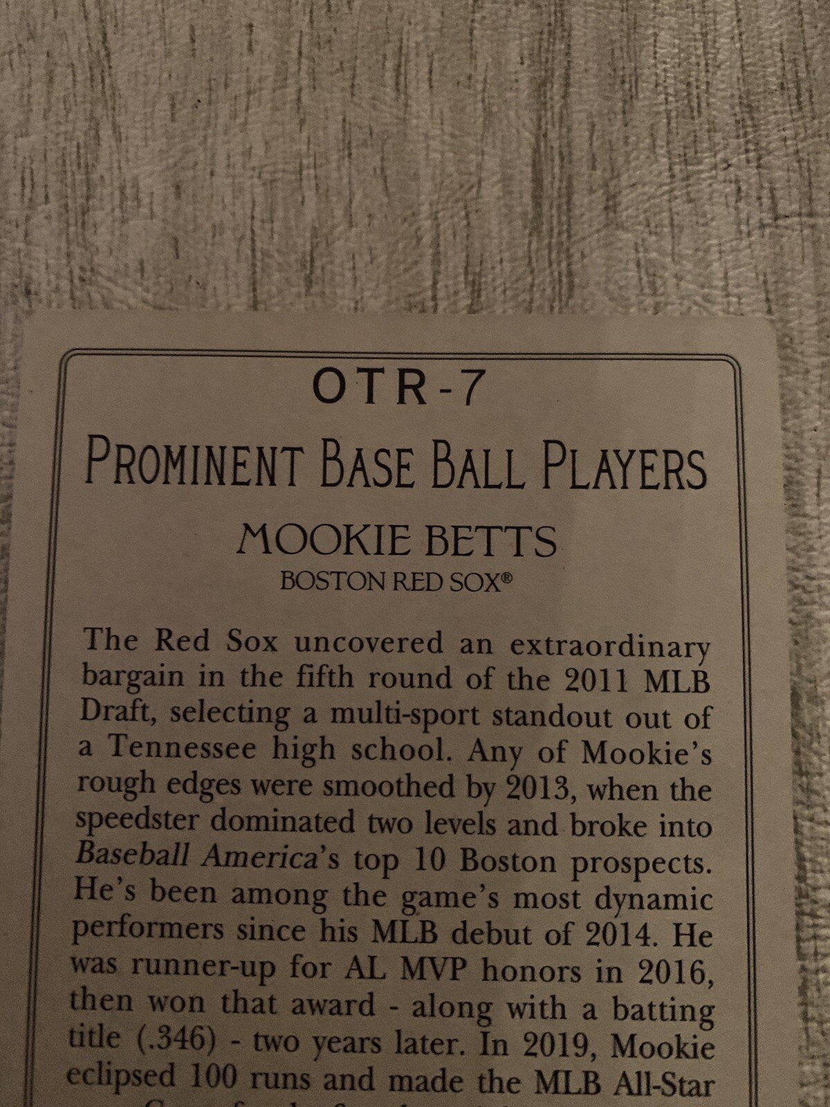 2020 topps series 1 Turkey Red box topper Mookie Betts Red Soxes OTR-7.