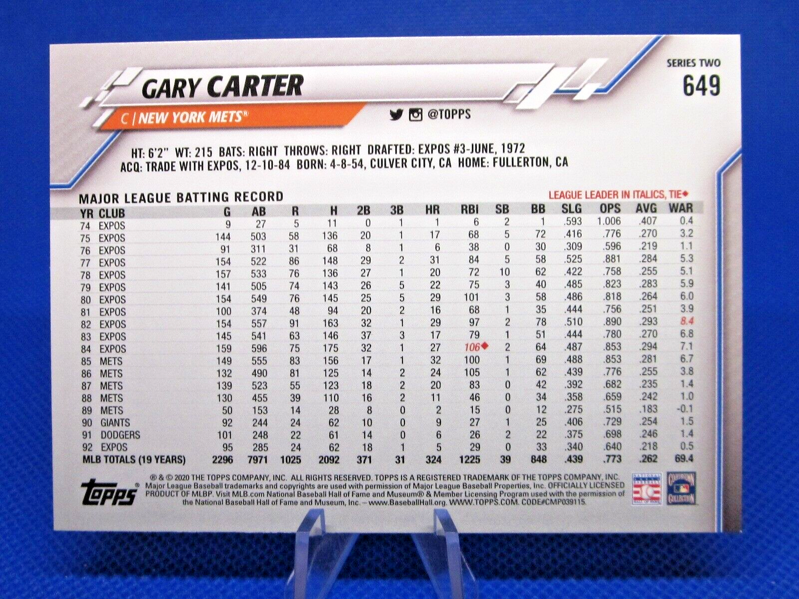 Here I have a 2020 Topps Series 2 short print of Gary Carter. This card is number 649. I have a lot of short print and parallel cards from different years and different series listed. Please check them out. I offer free shipping on all my items. Your card will be shipped in a semi rigid top loader inside a plain white envelope. With a tracking number provided. Any orders that total over $20 will be shipped in a bubble mailer with a tracking number. I have been with Ebay since 2002 and have maintained a 100 percent positive feedback throughout. So buy from a trusted seller. Please feel free to ask any questions.
