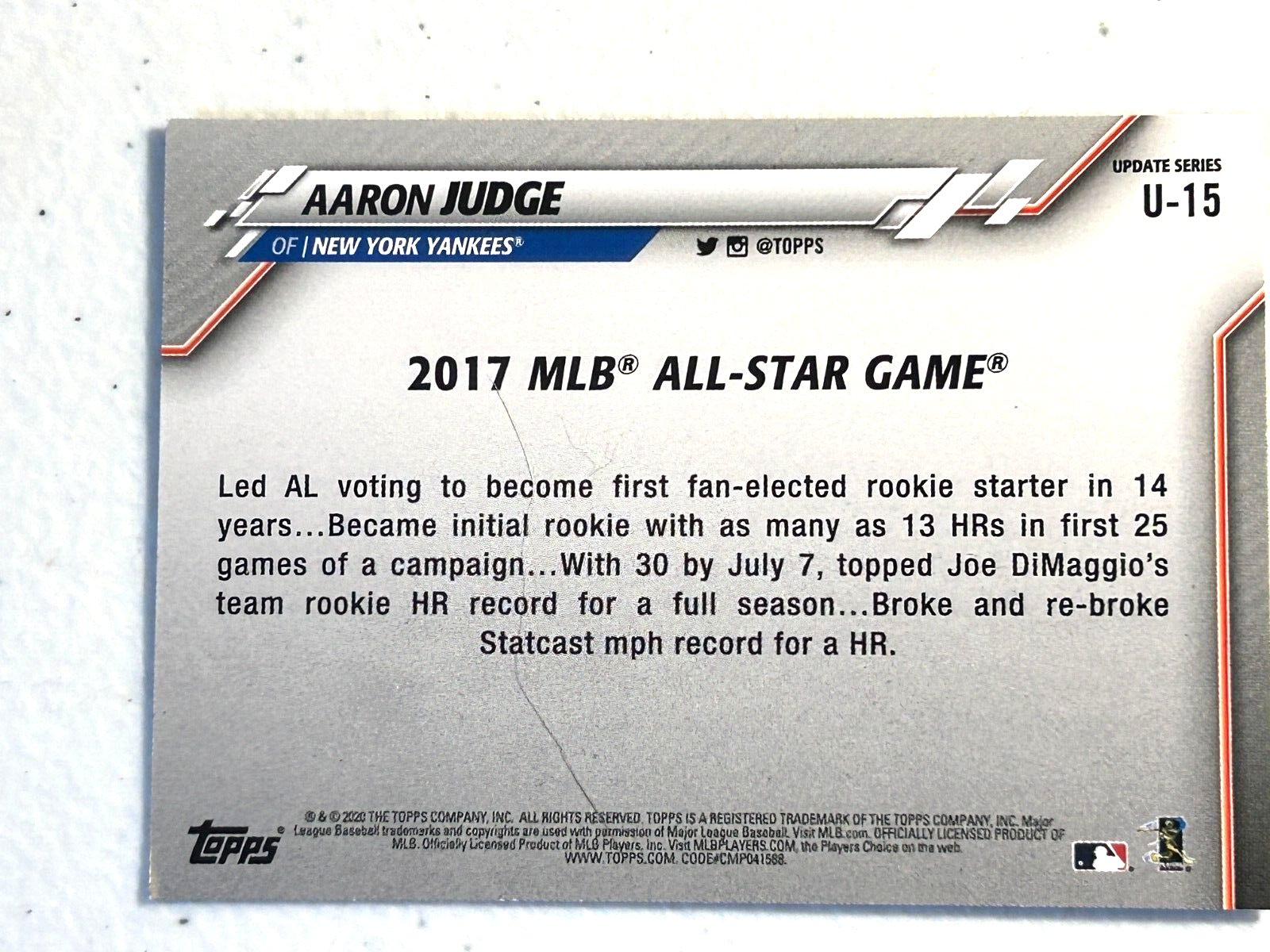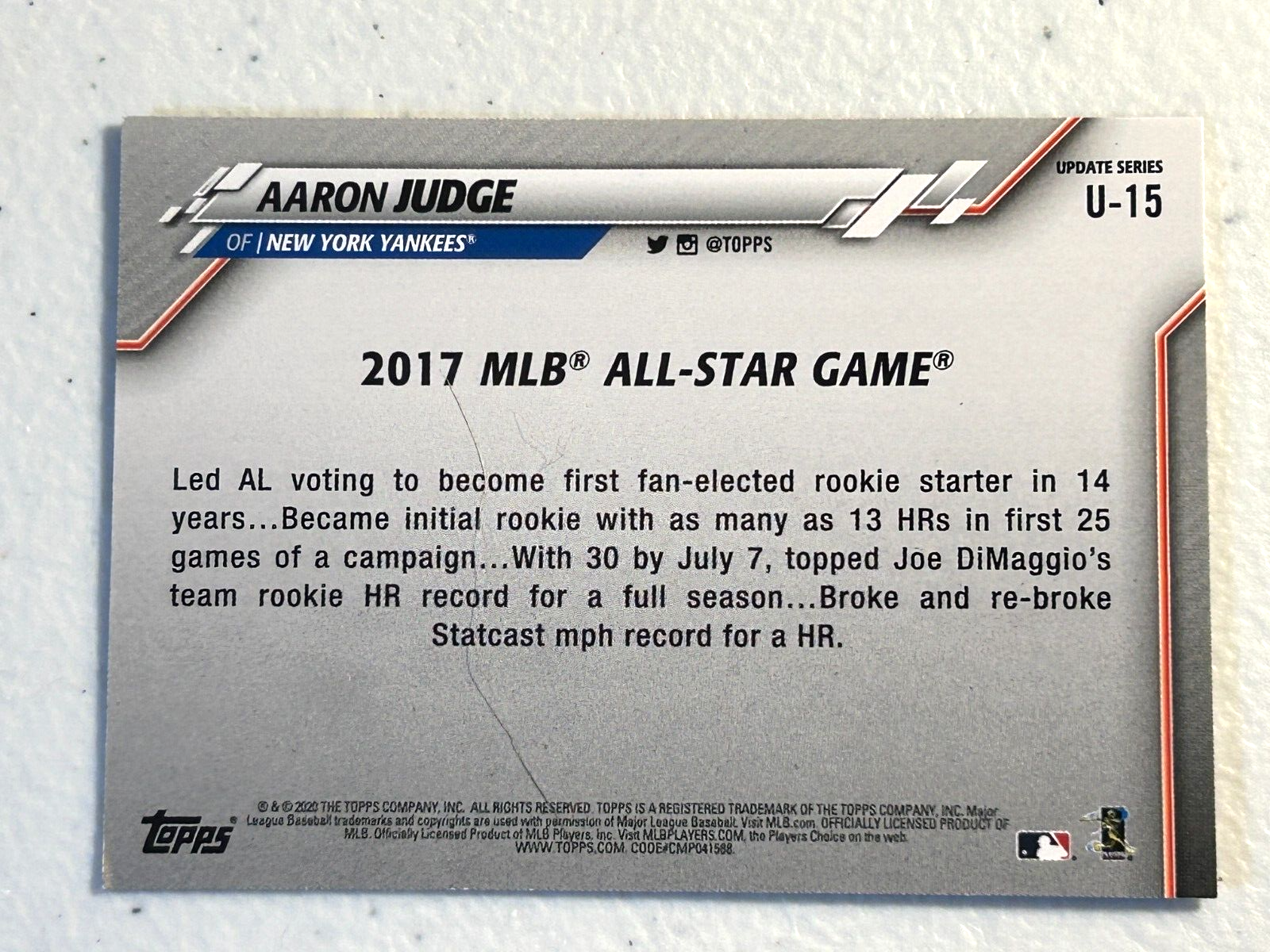This Aaron Judge All-Star Game card is a must-have for any Yankees fan! The navy blue design really pops, and the condition looks sharp—clean edges, no visible flaws. Seller provides plenty of photos so you know exactly what you're getting, and their return policy is fair. Great addition to my collection!