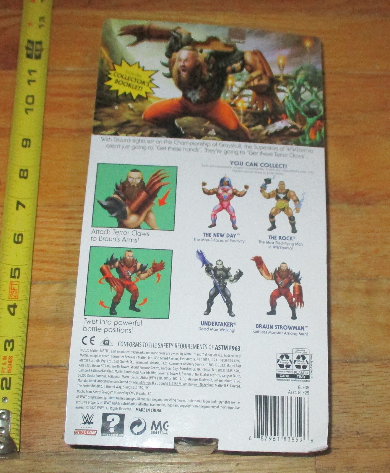 This item is a WWE WWF Mattel in Package figure of current WWF WWE wrestling star The Monster Among Men Braun Strowman. He was part of the WWF WWE Masters of the Universe MOTU crossover series. He includes a vest and a collectors booklet. He was produced in 2020 by Mattel and is in its sealed Package however there is damage to the bottom corners as can be seen in the photos. Shipping outside of the United States will be extra. Please check out my other wrestling auctions and contact me with any questions or wrestling related item requests. Serious bidders only as negative comments will be placed if bids are not completed. Good Luck