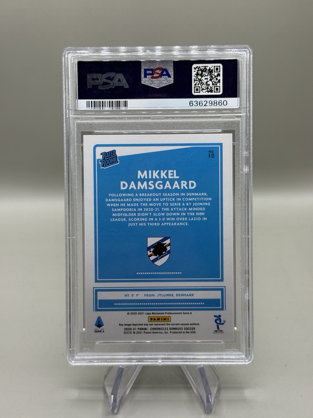Explore the world of sports memorabilia with the 2020-21 Panini Chronicles - Donruss Serie A #10 Mikkel Damsgaard rookie card. This Press Proof Green parallel variety card is a must-have for collectors and fans of the U.C. Sampdoria midfielder. With its limited print run of just 5, this card is as exclusive as it gets. Graded a perfect 10 by the Professional Sports Authenticator (PSA), the card ensures top-notch quality and authenticity. Featuring serial numbering, this Mikkel Damsgaard card is a tangible piece of sports history from the 2020-21 Serie A season. Add it to your collection and own a piece of the game you love.
