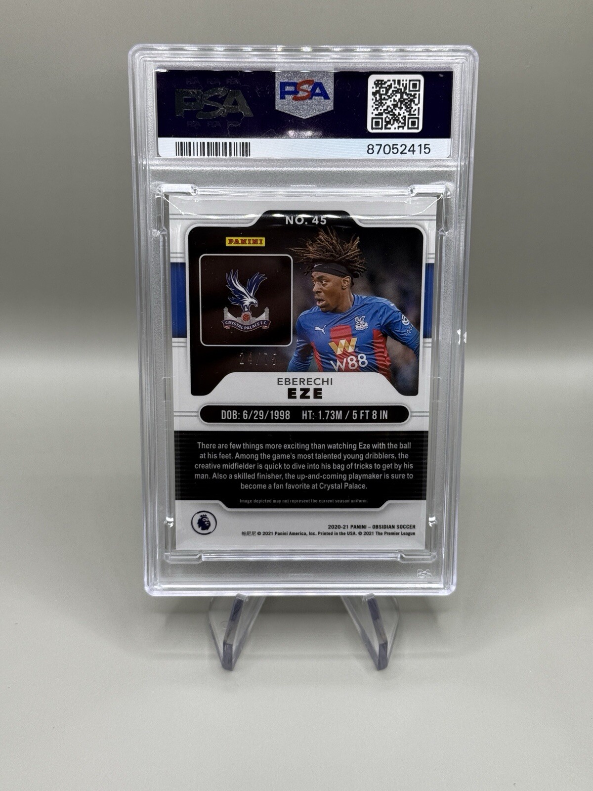 Elevate your collection with the 2020-21 Panini Obsidian Electric Edge Purple card featuring rising star Eberechi Eze of Crystal Palace F.C. This card is a standout with its unique Electric Etch Purple parallel, showcasing the talent and potential of the young soccer player. With a limited print run of just 75, this serial numbered rookie card is a must-have for fans and collectors alike. Carefully crafted by Panini and authenticated by the Professional Sports Authenticator (PSA), this card is a testament to Eze's debut season in the Premier League. Its grade of 9 reflects its excellent quality, making it an impressive addition to any soccer card collection or a special gift for the avid fan of the sport.