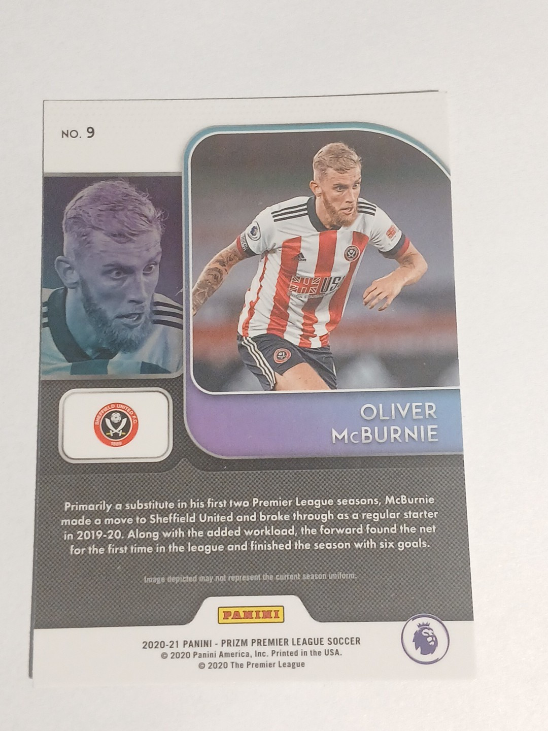 Elevate your collection with the 2020-21 Panini Prizm Premier League #9 Oliver McBurnie Instant Impact card. This trading card features the Sheffield United striker and is a must-have for fans of the sport. The card is from the Instant Impact insert set and showcases McBurnie in his Premier League uniform. The card is in excellent shape and is perfect for collectors of sports memorabilia. The 2020 season was a memorable one for McBurnie and this card captures that moment perfectly. Don't miss out on the chance to add this card to your collection.