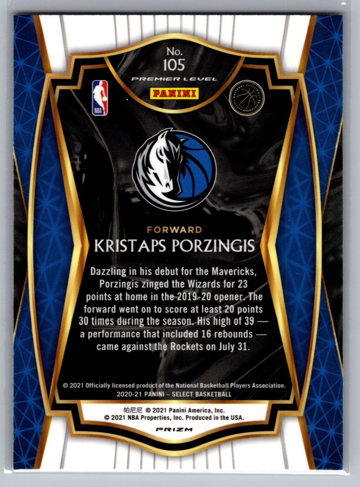 2020-21 Panini Select - Premier Level #105 Kristaps PorzingisAll cards are in Excellent condition or better. Some scans may show scratching of the penny sleeve. Please feel free to reach out for additional pictures. Thanks for looking!