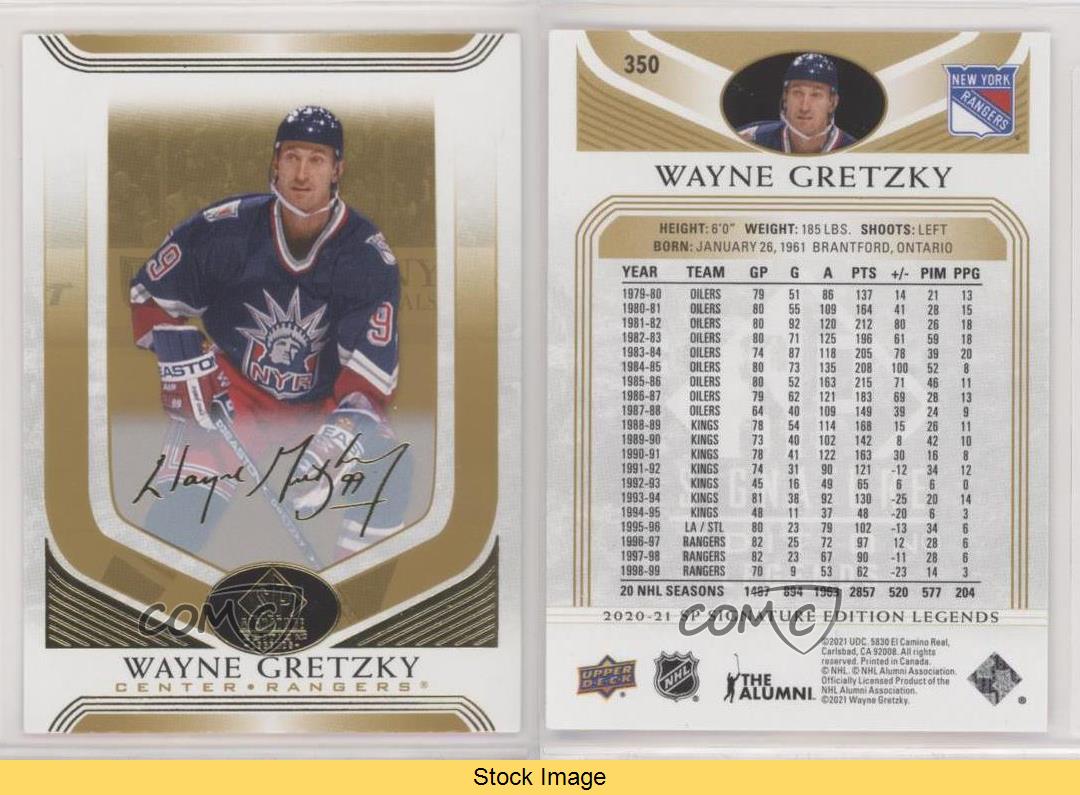 2020-21 Upper Deck SP Signature Edition Legends - [Base] - Gold #350 SP - Wayne Gretzky - Ice Hockey Card - Featuring the New York Rangers - Featuring Wayne Gretzky Search for more: 2020-21 Upper Deck SP Signature Edition Legends Search for more: 2020-21 Upper Deck SP Signature Edition Legends - [Base] - Gold View all of our Listings Auctions Buy It Now About Us Located in the beautiful Pacific Northwest, COMC (Check Out My Cards) is the world's largest consignment service for trading card singles. More than 10,000 people have used our consignment service to list over 50 million trading cards. Find out how we can help you consign your items on eBay by contacting us through eBay messaging. COMC -- "The Safe & Easy Way to Buy & Sell" Representative Image - Select Specific Item above to see image of actual item Representative Image - Select Specific Item above to see image of actual item Raw Condition for Modern Cards Unless otherwise noted, raw modern cards are listed in Near Mint-Mint condition or better. A NM-MT card appears to be Mint at first glance, but upon closer inspection, may exhibit some of the following: minor print defects (e.g. roller marks, print line, dimple), minor scratches, slight edge wear, and slight corner wear. Centering is clearly visible in the images provided and does not factor into our condition assessment. Raw Condition for Vintage Cards Unless otherwise noted, raw vintage cards are listed in Excellent condition or better. An EX card may exhibit some of the following: minor rounding of corners, surface wear, print defects, light scratches, and slight edge wear/chipping. Centering is clearly visible in the images provided and does not factor into our condition assessment. Domestic Shipping Combined shipping for multiple items is available. To receive combined shipping, please ensure all desired items are in your eBay shopping cart before proceeding to checkout. eBay limits orders to 40 items per order. We automatically combine multiple orders placed on the same day. If you place multiple orders on the same day, please contact us to request a refund of applicable shipping costs. Signature confirmation may be required on invoices over $400. All cards are protected and shipped securely. International Shipping COMC offers eBay's International Shipping (EIS) for international orders under $2,500* (see country exceptions below). All duties and import fees are paid at checkout; in the rare event that there are additional import fees upon delivery, these are borne by the buyer. EIS packages route through a shipping hub in Erlanger, KY before shipping to their final destination. Please note that EIS does not allow for combined shipments. The shipping rates are determined by eBay and cannot be adjusted. *Maximum sale price exceptions: Colombia, Kuwait ($2,000); Taiwan ($1,539); Chile, Costa Rica, Guatemala, Honduras, Trinidad and Tobago ($1,000); Antigua and Barbuda, Aruba, Belize, Dominica, Grenada, Philippines, Saint Kitts and Nevis, Saint Lucia, Montserrat, Turks and Caicos Islands ($500); Dominican Republic, El Salvador ($200). Please request a shipping quote through eBay messaging for orders that exceed the maximum sale price supported by eBay's International Shipping. You will be responsible for all duties and import fees for international orders shipped outside the EIS. All cards are protected and shipped securely. Payment COMC does not accept offers on our cards through our eBay storefront. COMC utilizes eBay’s managed payments system. If you are experiencing difficulties making a payment, please contact eBay for assistance. Return Policy Returns are only accepted on the rare occasion the item is not as described. If you are making a return, please initiate the return process through eBay so a mailing label can be provided for you. Prior to listing, our expert team carefully assessed this item to represent it accurately. Please review the description and high-definition images prior to purchasing to ensure this item meets your satisfaction. We welcome you to contact us if you have further questions about this item. Trust and Integrity COMC carefully assesses each item consigned to us to prevent fraudulent items from entering the marketplace. If you believe an item offered on COMC may be fraudulent, please contact us with details so we can investigate the issue. Items we determine are outside our supported items policy may be removed. Last Modified: 7/2/2025 7:32:36 AM PDT