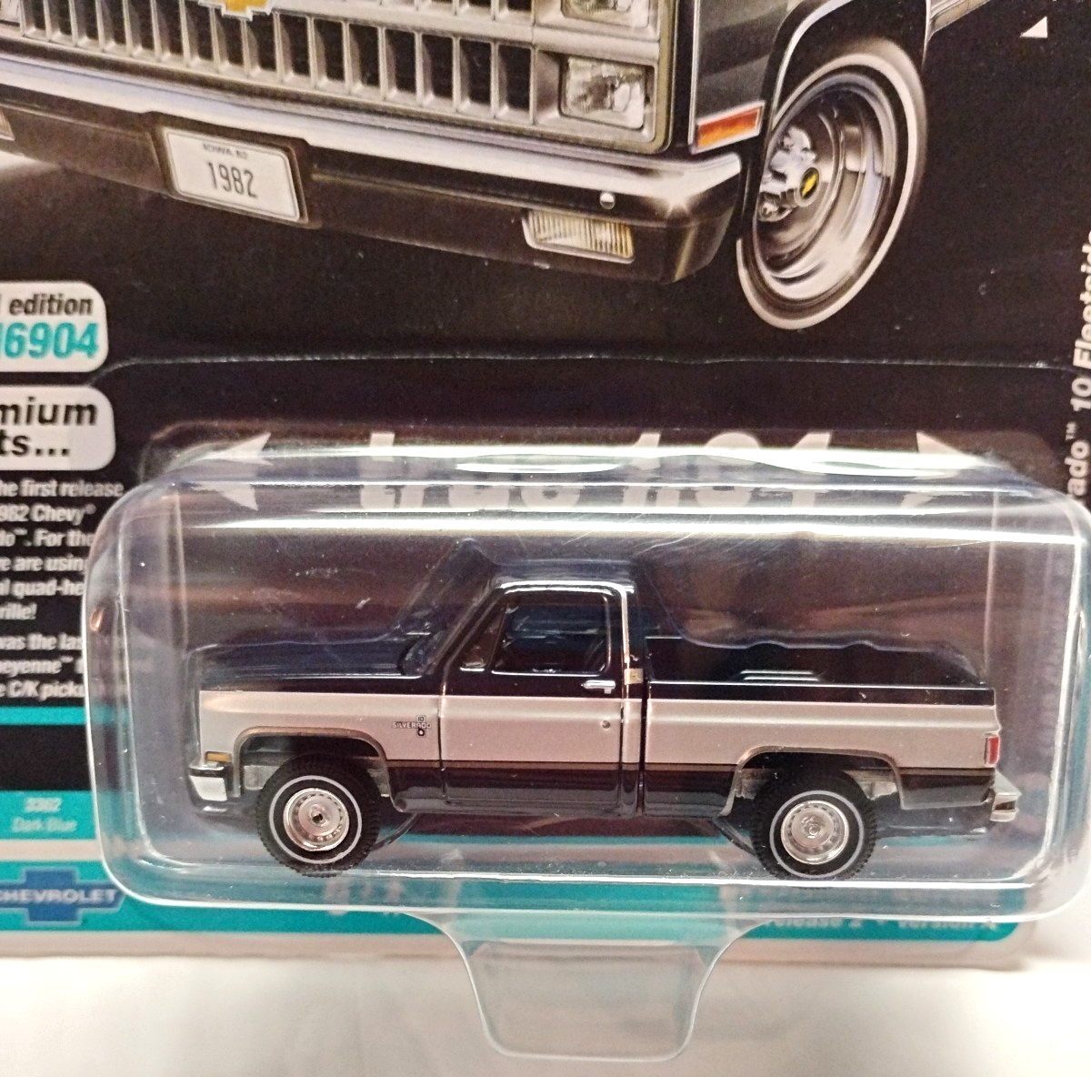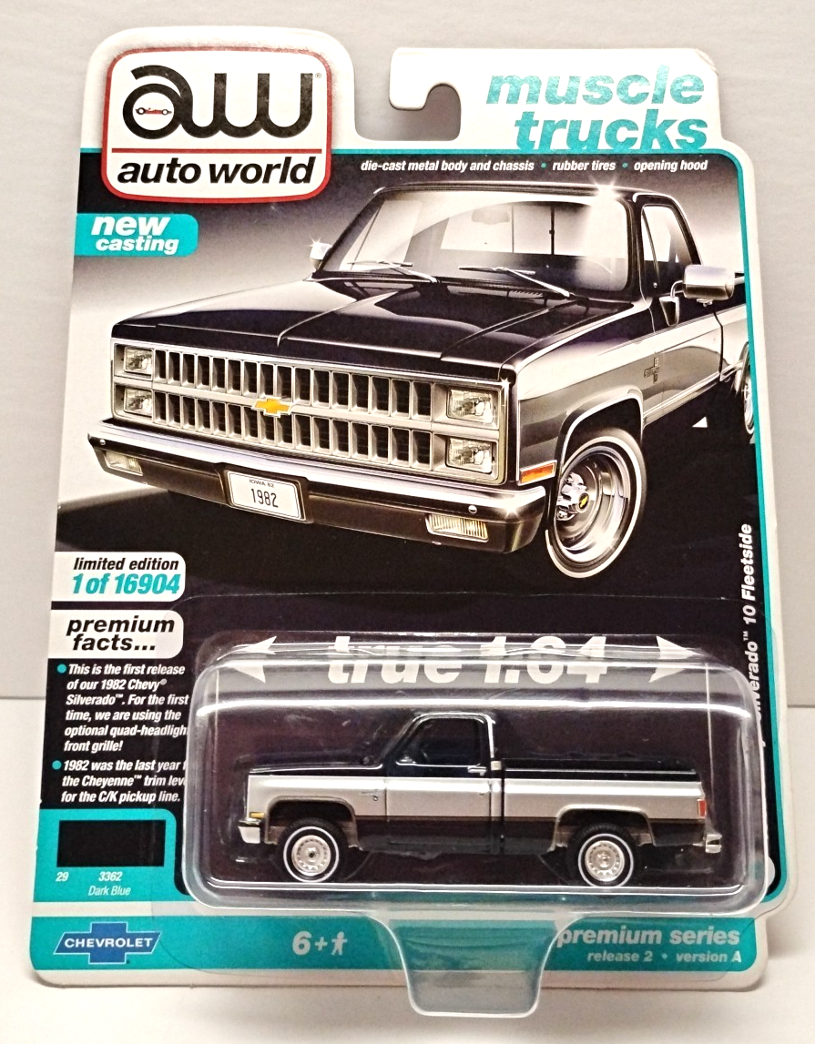 *INCLUDES: 2 Auto World Premium Series Muscle Trucks. New, never been opened. There is some wear and creasing to the cards. 1982 Chevy Silverado 10 Fleetside (Dark Blue): Release 2 - Version A (Limited Edition 1 Of 16904). 1982 Chevy Silverado 10 Fleetside (Black): Release 2 - Version A (Limited Edition 1 Of 16904). *There is a black spot on the front tire, see the last photo. *Does not come with plastic protectors. *FREE SHIPPING: The items will be carefully packed in a box for shipping.