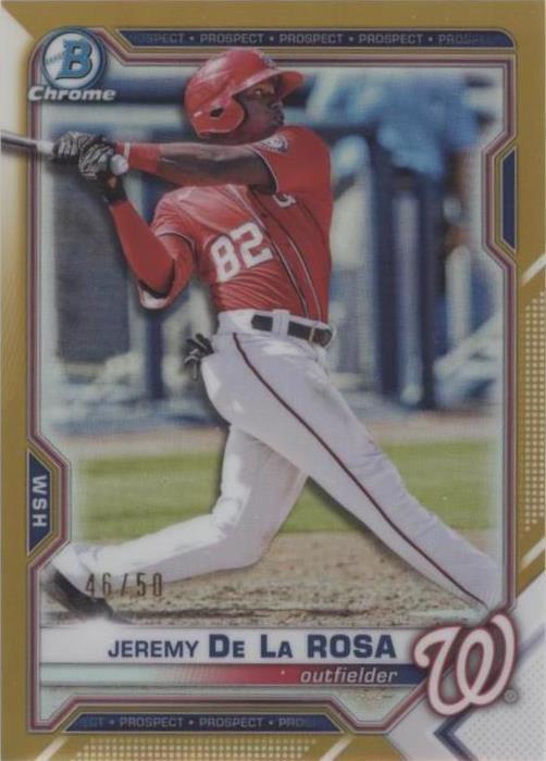 Series:Bowman DraftTeam:Washington NationalsFeatures:Rookie, Insert, Serial Numbered, Parallel/VarietySet:2021 Bowman DraftInsert Set:ChromePrint Run:50brand:ToppsPlayer/Athlete:Jeremy De La RosaParallel/Variety:Gold RefractorLeague:Major League Baseball (MLB)Manufacturer:ToppsSport:BaseballSeason:2021Card Number:BDC-2