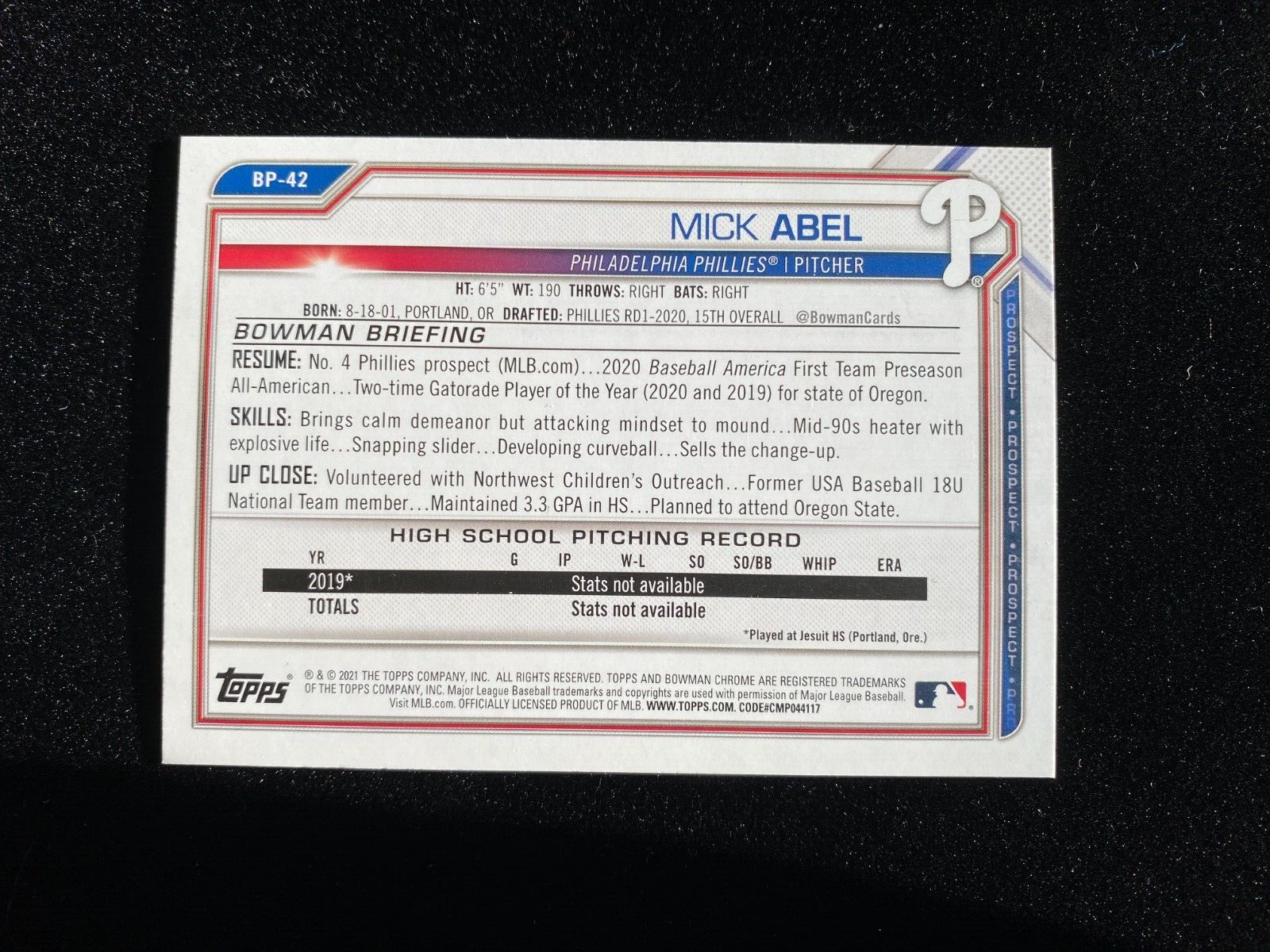 2021 Bowman MICK ABEL 1st Rookie CAMO Paper Parallel #BP-41 Philadelphia Phillies RC SP QUANTITY (1) CAMO Paper Parallel #BP-41 All cards are at least NRMT unless noted. Some raw cards I list are potential GEM Mint Cards, but please note that all raw ungraded cards may contain pixelated dimples, scratches, printer lines, indents, edge chipping or corner whitening, along with other common condition issues. The card/s pictured in each listing is the card/s received, if you have condition questions please ask. If you're looking for guaranteed GEM MINT 10 cards then I suggest buying cards that are already graded. I will not accept returns under any circumstances, buying sports cards is similar to buying stocks and you cannot return stocks, so please do not try and return the card to me. Most are pulled by me directly from packs and immediately put into sleeves, I do not inspect every card for every potential flaw, so card/s could have no flaws. Card ships USPS, if the card sells for under $20 it will be shipped in PWE, if the card sells for more than $20 it will ship GROUND ADVANTAGE, regardless of S&H cost, I don't know how much the card is going to sell for before it's sold, so I'm just guessing. If auction ends for less than $20 and you would like me to ship in a bubble mailer, please let me know before paying for the auction and I will send an updated invoice. If Auction sells for more than $20 with a low S&H charge I will cover additional cost to ship. Combined shipping is available, at roughly one dollar per additional Listing, with a cap around $10 depending on weight.