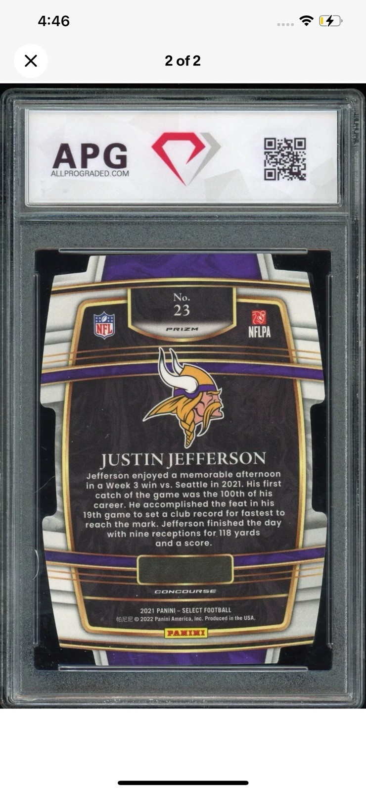 Elevate your sports card collection with the 2021 Justin Jefferson GEM MT 10 Panini Select Black & Gold Prizm Die-Cut #23. This card, a true gem for football enthusiasts, features the dynamic wide receiver in stunning detail. The Black Gold parallel variety adds an exclusive touch, making it a standout piece. Expertly graded as a perfect 10, this card showcases exceptional quality and preservation. Whether you're a fan of Jefferson, a collector of football memorabilia, or someone who appreciates finely crafted items, this card is a must-have. It's a brilliant representation of sports excellence and collecting artistry.