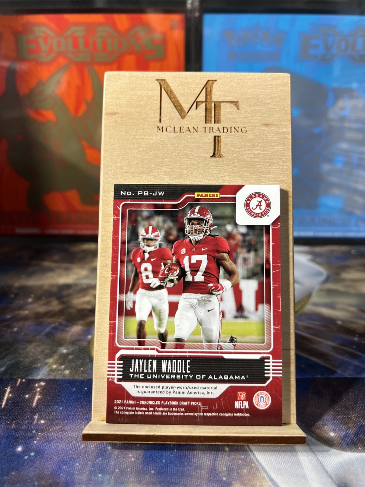 The 2021 Panini Chronicles Jaylen Waddle Playbook Down & Dirty Conference Patch 1/1 is a highly sought-after sports trading card featuring the rookie player from the Alabama Crimson Tide. This rare card is part of the 2021 Panini Chronicles Draft Picks set and showcases a unique PlayBook Down & Dirty insert design. The card is serial numbered 1/1 and includes a special Conference Patch variation, making it a valuable collector's item for fans of football trading cards. With its limited print run and exclusive features, this card is a standout piece for those looking to add a premium item to their collection.
