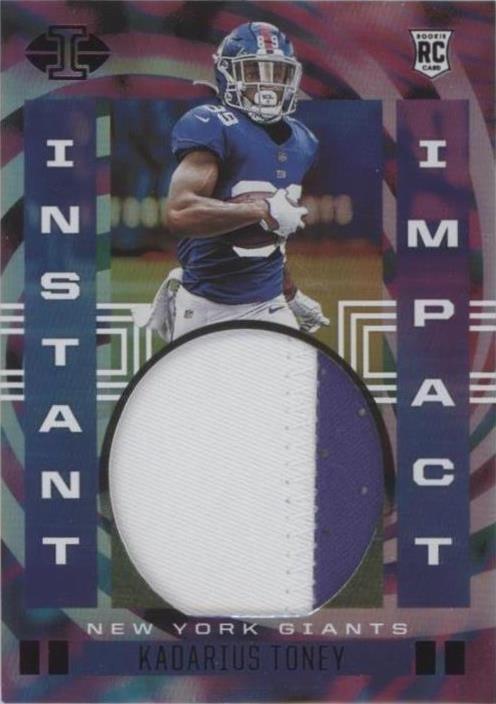 The 2021 Kadarius Toney Panini Illusions Rookie Instant Impact Patch RC is a highly sought-after trading card featuring a patch from the National Football League athlete. With only 50 copies in existence, this black parallel card showcases Toney in his rookie season, making it a valuable addition to any collection.