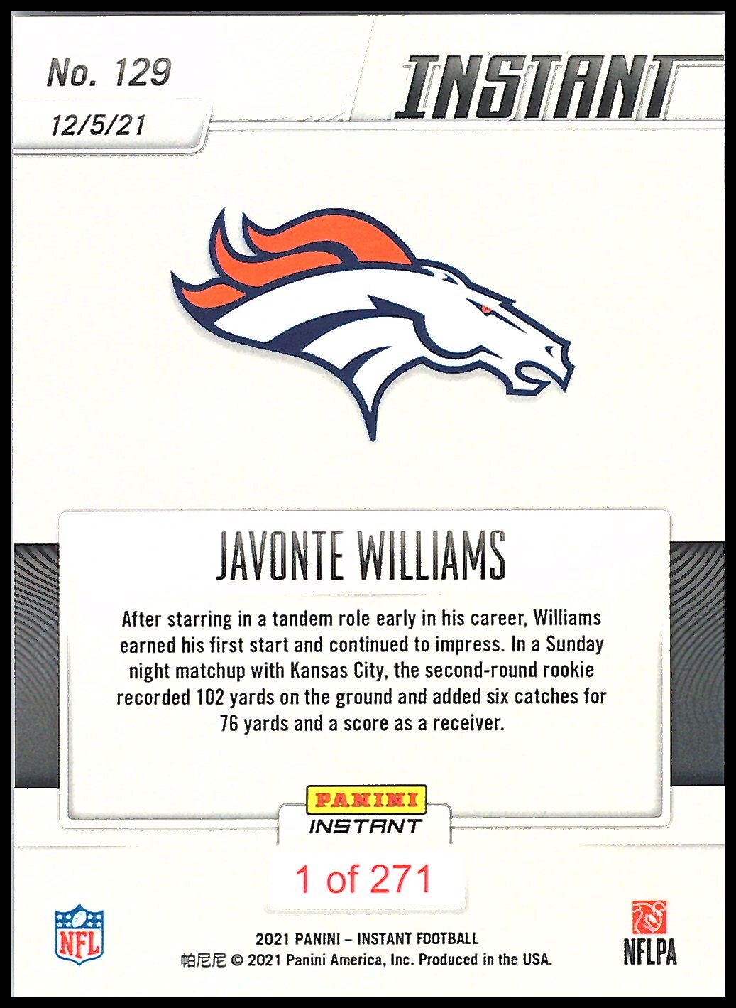 2021 Panini Instant NFL #129 Javonte Williams . Other important information about this card: PR271 In 2021 Javonte Williams played for the Denver Broncos. Please check out our other listings for more great cards