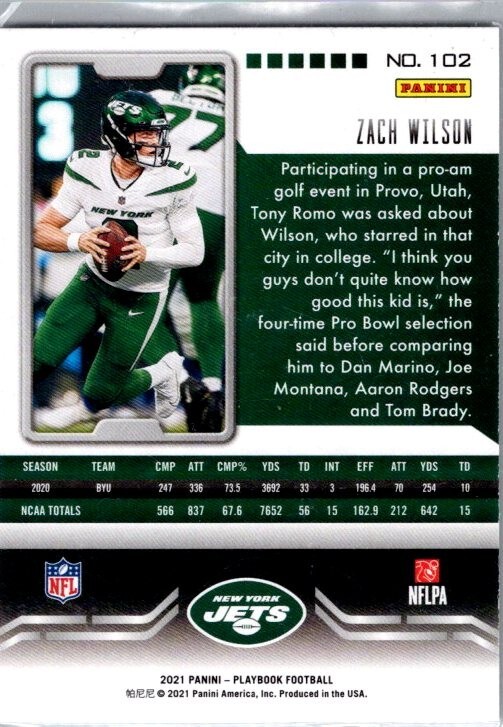 Capture a piece of sports history with the 2021 Panini Playbook Rookie Card #102 featuring the promising talent, Zach Wilson. As a standout addition to any football card collection, this card commemorates Wilson’s inaugural NFL season with the New York Jets. Proudly manufactured by Panini, the trusted name in sports memorabilia, this card is part of the iconic 2021 Panini Playbook set. It showcases the Base variety and is a must-have for enthusiasts of the game and collectors alike, offering a tangible connection to the on-field action of the National Football League.