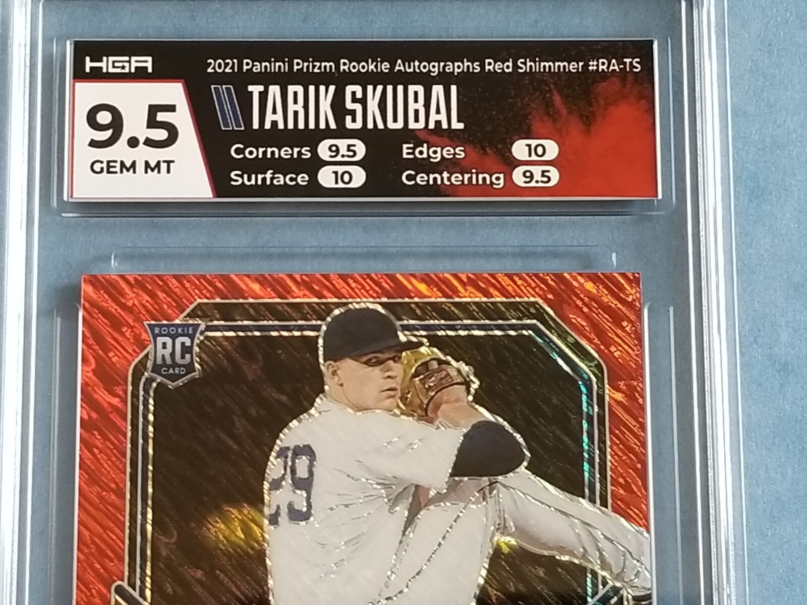 Item For Sale: 2021 Panini Prizm Baseball First Off The Line "Red Shimmer" Prizm Rookie Autographed card of Detroit Tigers Superstar Pitcher TARIK SKUBAL Card # RA-TS. SERIAL #'D- 7/7. Card has been graded by HGA as a GEM Mint 9.5 Sub-Grade include: Corners: 9.5 Surface: 10.0 Edges: 10.0 Centering: 9.5 This is the extremely limited First Off the Line Shimmer Prizm Parallel, exclusive to FOTL Boxes, limitedto just 7 copies. You will be receiving the exact card shown in the images, please review before purchasing. Card will be shipped to you inside a team bag, between cardboard, bubble wrapped, placed inside a leaf trading card box & mailed inside a priority box for added protection, with tracking. Items over $200 will include insurance with the tracking. Payment is due with 7 days of auctions and or item will be relisted.