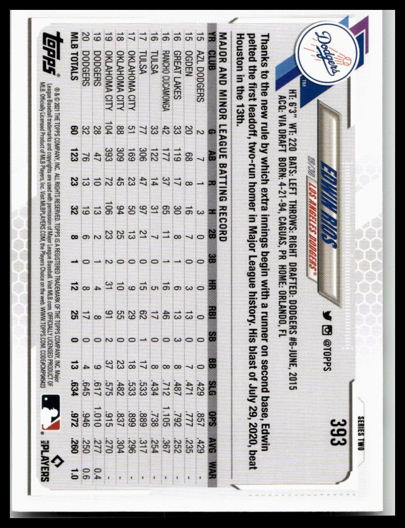 This is a nice example of a 2021 Topps #393 Edwin Rios Other important information about this card: In 2021 Edwin Rios played for the Los Angeles Dodgers. Please check out our other listings for more great cards.
