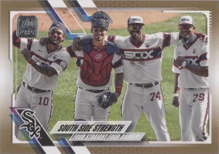 Subset: Checklist Parallel/Variety: Gold Print Run: 2021 Season: 2021 Features: Serial Numbered, Base Set, Parallel/Variety League: Major League Baseball (MLB) Set: 2021 Topps Sport: Baseball Additional Description: Checklist - South Side Strength (Four Straight Four-Baggers) Series: Topps brand: Topps Card Number: 486 Player/Athlete: Eloy Jimenez, José Abreu, Yasmani Grandal, Yoan Moncada Team: Chicago White Sox Manufacturer: Topps