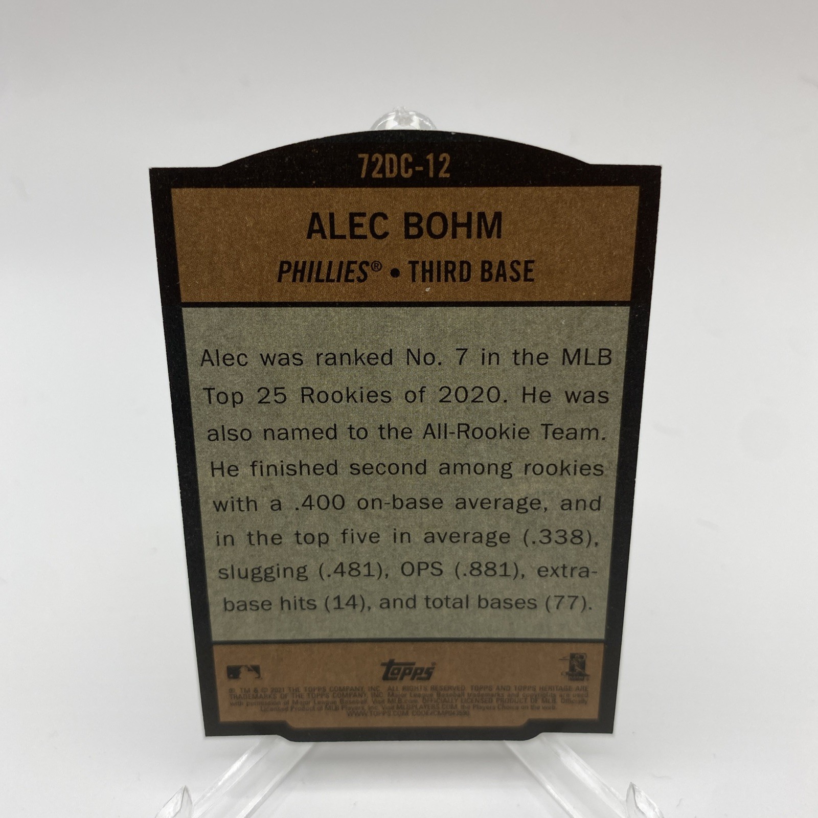 The 2021 Topps Heritage Alec Bohm Action Variant Mini Dicut 72DC-12 Phillies trading card is a collectible item featuring the up-and-coming MLB player Alec Bohm. This mini card is part of the 2021 Topps Heritage set and showcases a unique action variant design. Made of durable card stock with a thickness of 20 Pt., this original insert card is a must-have for fans of the Philadelphia Phillies and baseball memorabilia collectors alike. With a nod to the World Series and Major League Baseball, this card is a valuable addition to any sports trading card collection.