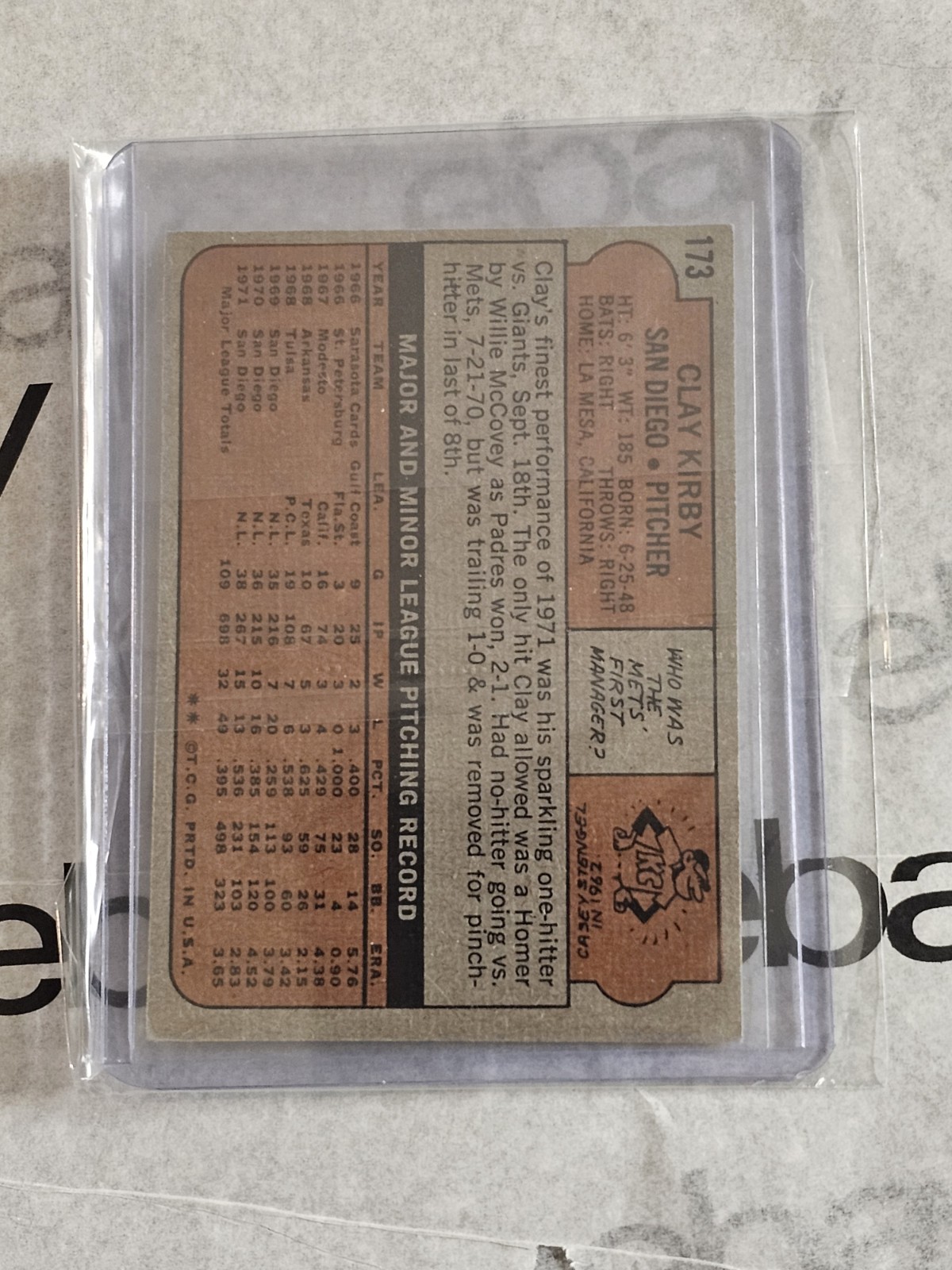 The 2021 Topps Heritage Clay Kirby 50th Anniversary 1972 Buyback Card #173 is a single baseball trading card manufactured by Topps in 2022. It belongs to the Major League era post-WWII (1942-1980) and features a short print, stamped design. This original card pays homage to the 1972 vintage version and is part of the 2021 Topps Heritage set, celebrating the San Diego Padres team. Made in the United States, this buyback card is a unique collectible for fans of baseball memorabilia and trading card enthusiasts.