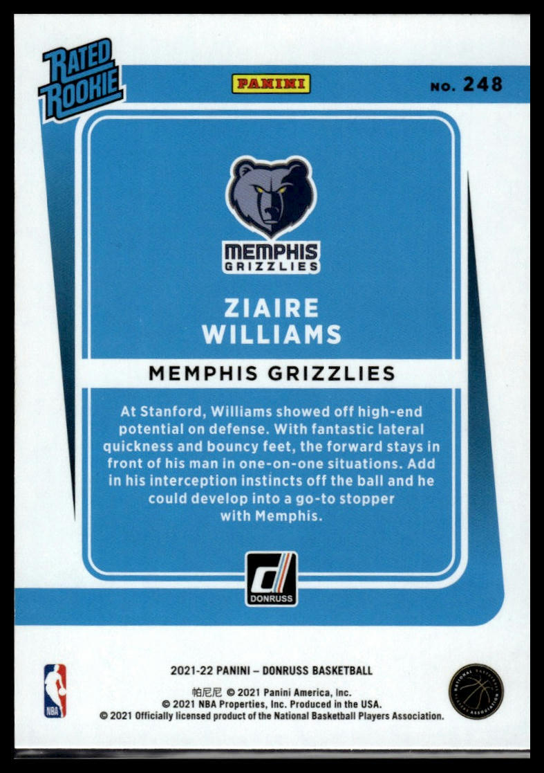 This is a nice example of a 2021-22 Donruss #248 Ziaire Williams Other important information about this card: Rated Rookie RC,Chase,Checklist,Parallel,Insert,SP,Base In 2021 Ziaire Williams played for the Memphis Grizzlies. Please check out our other listings for more great cards.