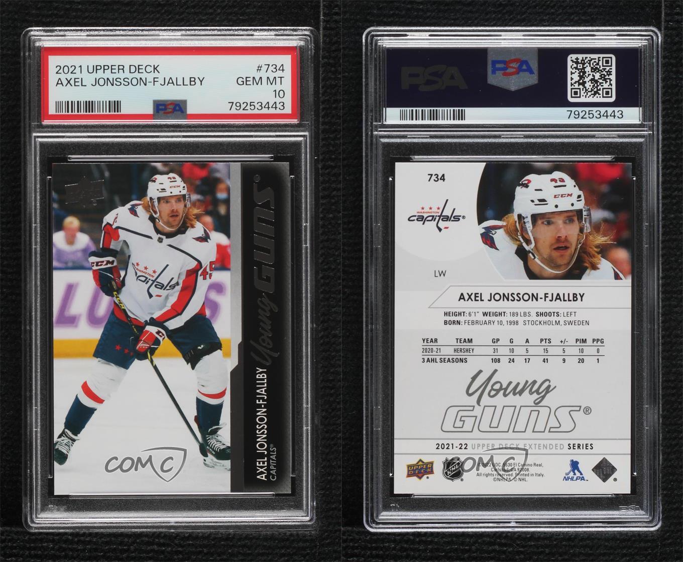 2021-22 Upper Deck Extended Series - [Base] #734 Young Guns - Axel Jonsson-Fjallby Graded PSA 10 GEM MT - RC (Rookie Card) - Ice Hockey Card - Featuring the Washington Capitals - Featuring Axel Jonsson-Fjallby Search for more: 2021-22 Upper Deck Extended Series Search for more: 2021-22 Upper Deck Extended Series - [Base] View all of our Listings Auctions Buy It Now About Us Located in the beautiful Pacific Northwest, COMC (Check Out My Cards) is the world's largest consignment service for trading card singles. More than 10,000 people have used our consignment service to list over 50 million trading cards. Find out how we can help you consign your items on eBay by contacting us through eBay messaging. COMC -- "The Safe & Easy Way to Buy & Sell" Representative Image - Select Specific Item above to see image of actual item Representative Image - Select Specific Item above to see image of actual item Raw Condition for Modern Cards Unless otherwise noted, raw modern cards are listed in Near Mint-Mint condition or better. A NM-MT card appears to be Mint at first glance, but upon closer inspection, may exhibit some of the following: minor print defects (e.g. roller marks, print line, dimple), minor scratches, slight edge wear, and slight corner wear. Centering is clearly visible in the images provided and does not factor into our condition assessment. Raw Condition for Vintage Cards Unless otherwise noted, raw vintage cards are listed in Excellent condition or better. An EX card may exhibit some of the following: minor rounding of corners, surface wear, print defects, light scratches, and slight edge wear/chipping. Centering is clearly visible in the images provided and does not factor into our condition assessment. Domestic Shipping Combined shipping for multiple items is available. To receive combined shipping, please ensure all desired items are in your eBay shopping cart before proceeding to checkout. eBay limits orders to 40 items per order. We automatically combine multiple orders placed on the same day. If you place multiple orders on the same day, please contact us to request a refund of applicable shipping costs. Signature confirmation may be required on invoices over $400. All cards are protected and shipped securely. International Shipping COMC offers eBay's International Shipping (EIS) for international orders under $2,500* (see country exceptions below). All duties and import fees are paid at checkout; in the rare event that there are additional import fees upon delivery, these are borne by the buyer. EIS packages route through a shipping hub in Erlanger, KY before shipping to their final destination. Please note that EIS does not allow for combined shipments. The shipping rates are determined by eBay and cannot be adjusted. *Maximum sale price exceptions: Colombia, Kuwait ($2,000); Taiwan ($1,539); Chile, Costa Rica, Guatemala, Honduras, Trinidad and Tobago ($1,000); Antigua and Barbuda, Aruba, Belize, Dominica, Grenada, Philippines, Saint Kitts and Nevis, Saint Lucia, Montserrat, Turks and Caicos Islands ($500); Dominican Republic, El Salvador ($200). Please request a shipping quote through eBay messaging for orders that exceed the maximum sale price supported by eBay's International Shipping. You will be responsible for all duties and import fees for international orders shipped outside the EIS. All cards are protected and shipped securely. Payment COMC does not accept offers on our cards through our eBay storefront. COMC utilizes eBay’s managed payments system. If you are experiencing difficulties making a payment, please contact eBay for assistance. Return Policy Returns are only accepted on the rare occasion the item is not as described. If you are making a return, please initiate the return process through eBay so a mailing label can be provided for you. Prior to listing, our expert team carefully assessed this item to represent it accurately. Please review the description and high-definition images prior to purchasing to ensure this item meets your satisfaction. We welcome you to contact us if you have further questions about this item. Trust and Integrity COMC carefully assesses each item consigned to us to prevent fraudulent items from entering the marketplace. If you believe an item offered on COMC may be fraudulent, please contact us with details so we can investigate the issue. Items we determine are outside our supported items policy may be removed. Last Modified: 6/26/2025 2:30:23 AM PDT